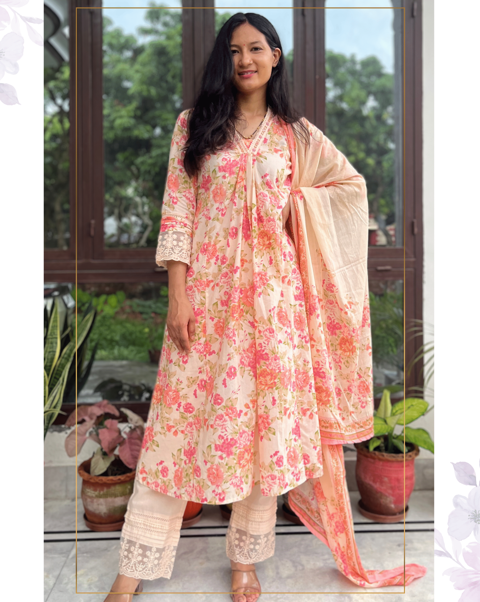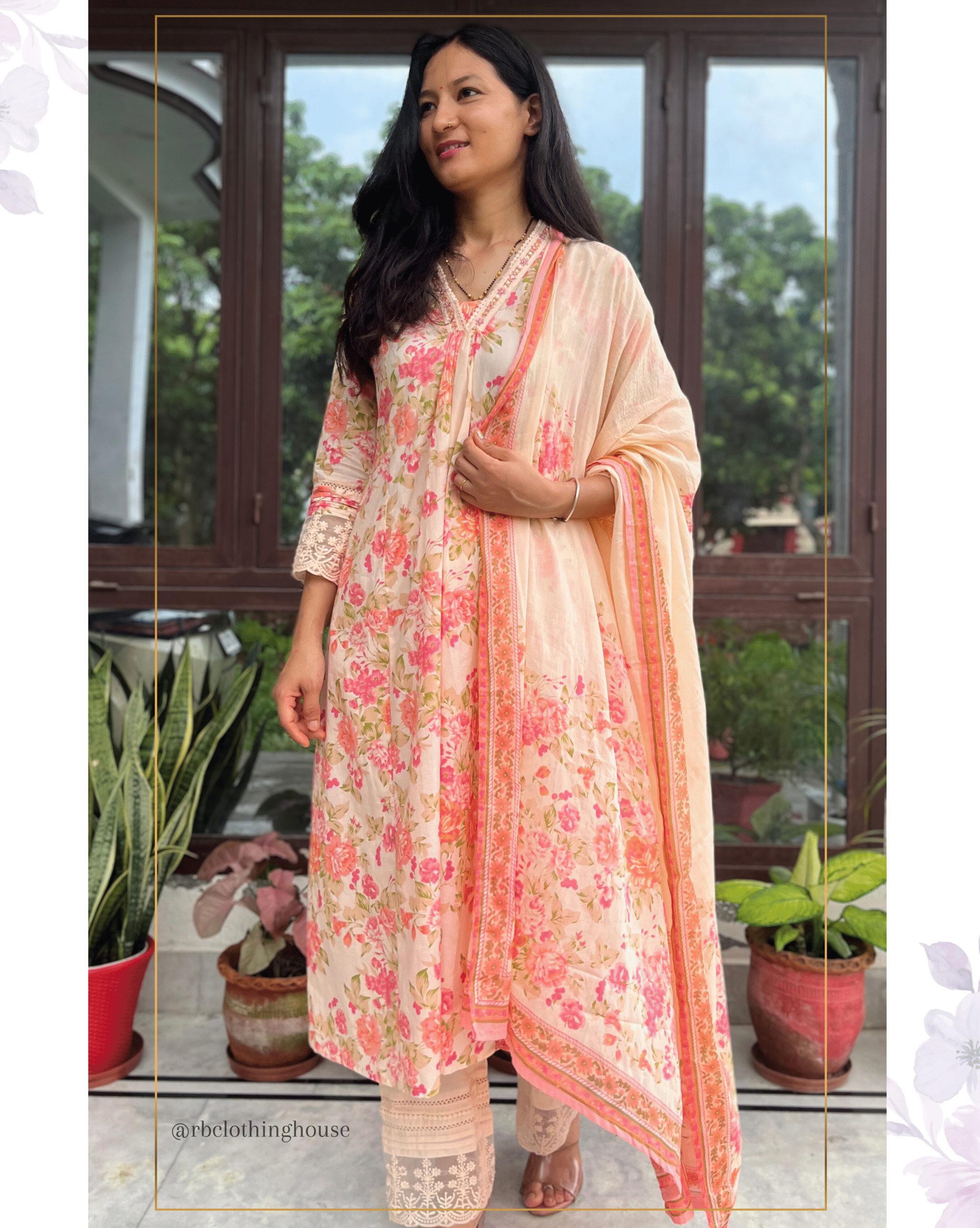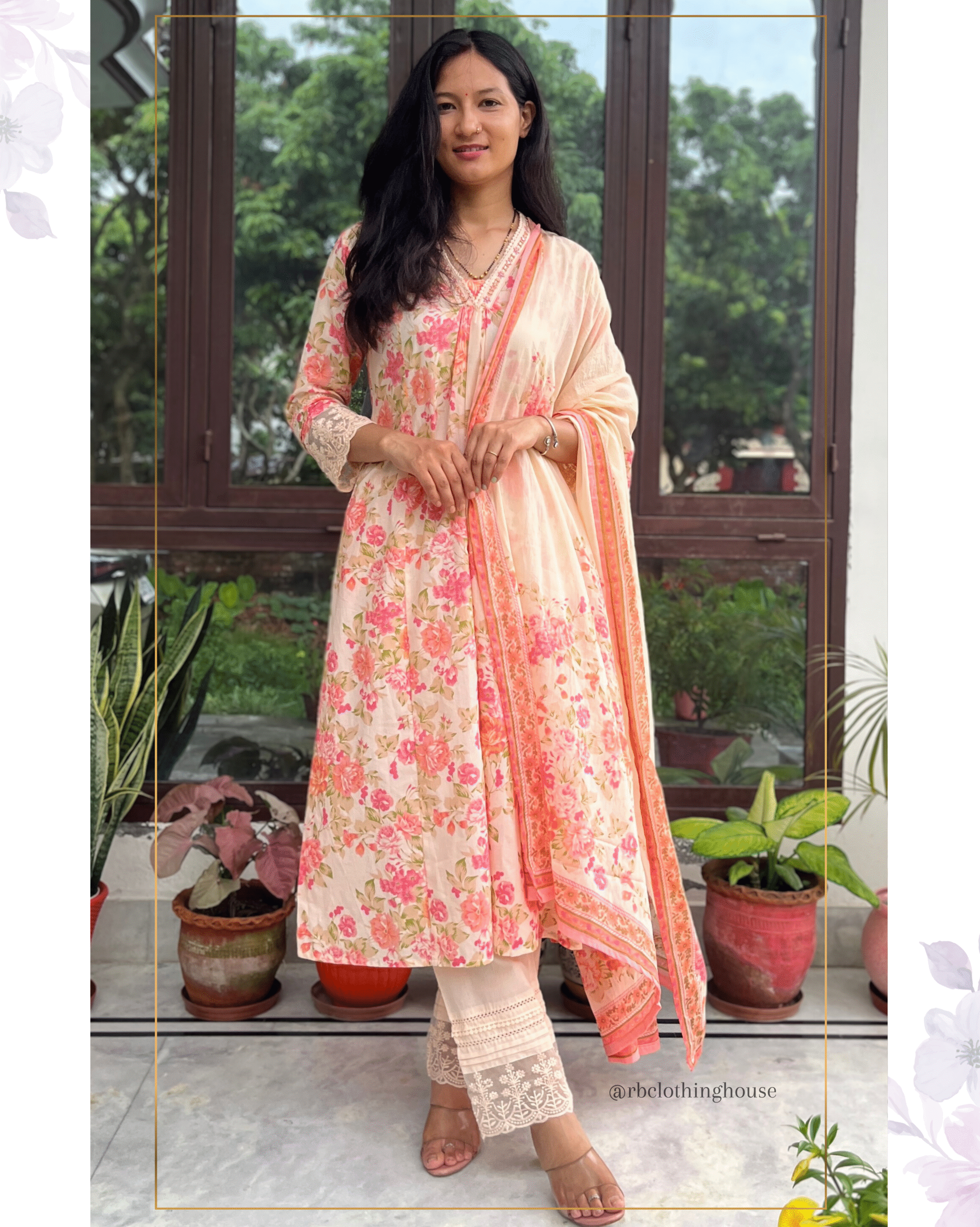 + Free ShippingSuper comfortable festive wear, A-line floral printed cotton suit set, with beautiful lace detailing & embroidery detailing in neckline. It is paired with solid pant and cotton printed dupatta.