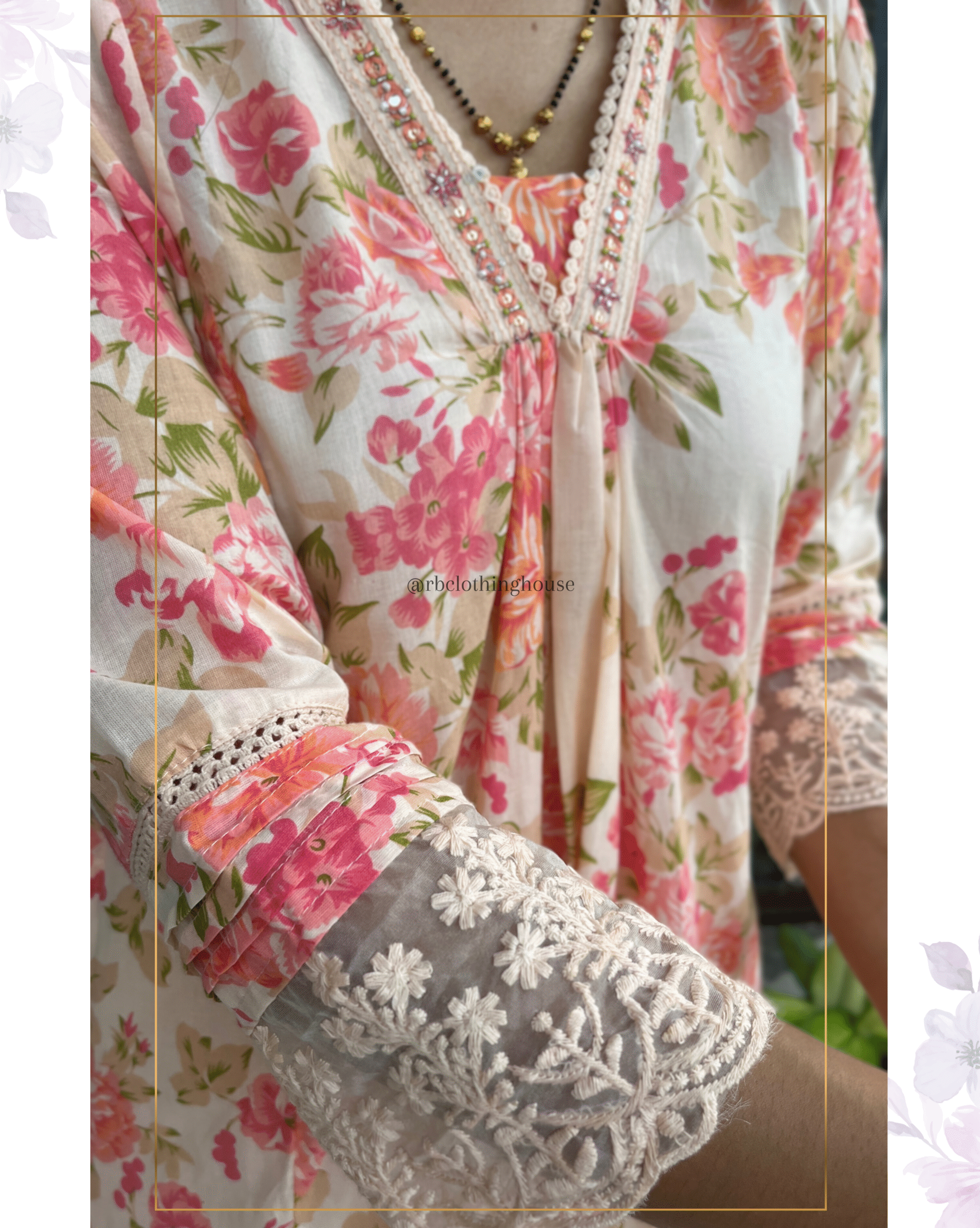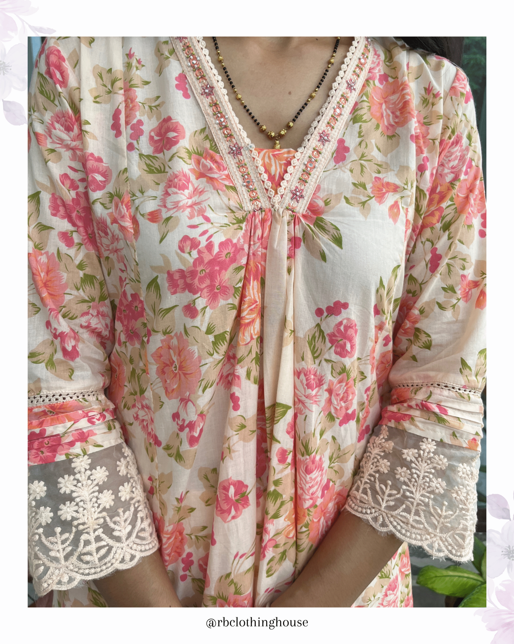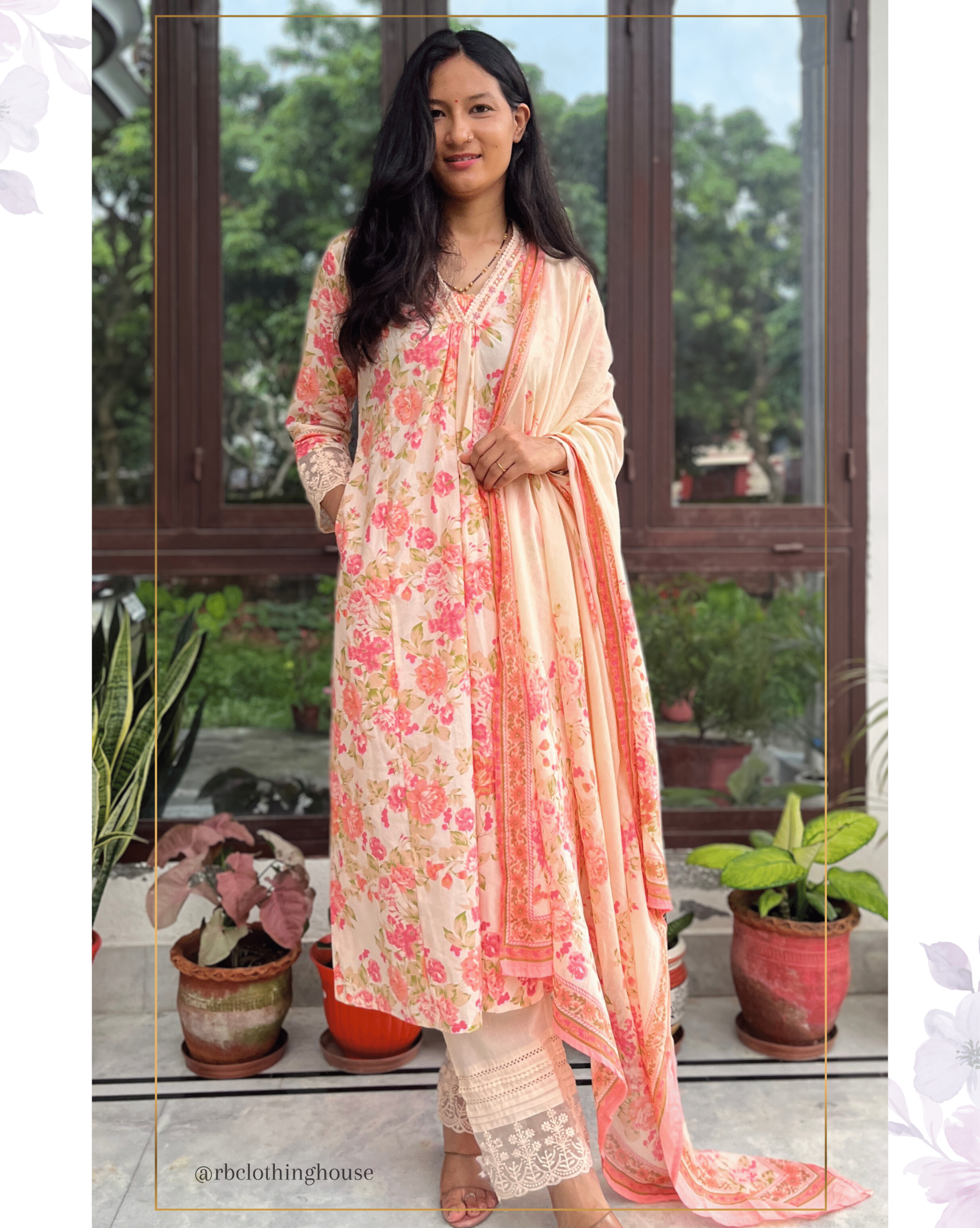 + Free ShippingSuper comfortable festive wear, A-line floral printed cotton suit set, with beautiful lace detailing & embroidery detailing in neckline. It is paired with solid pant and cotton printed dupatta.