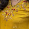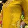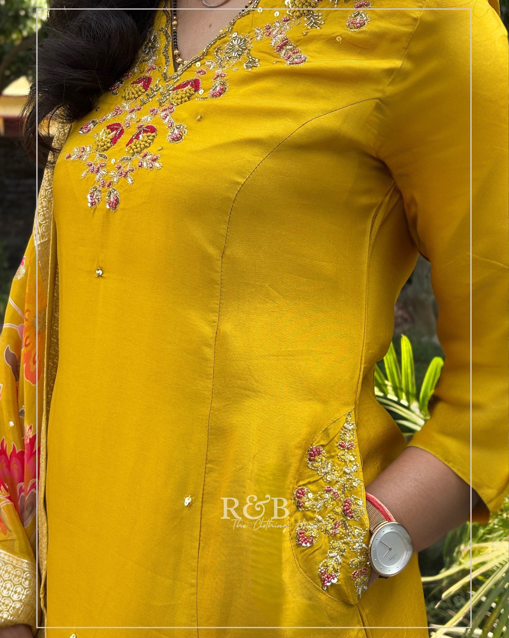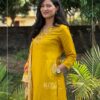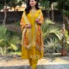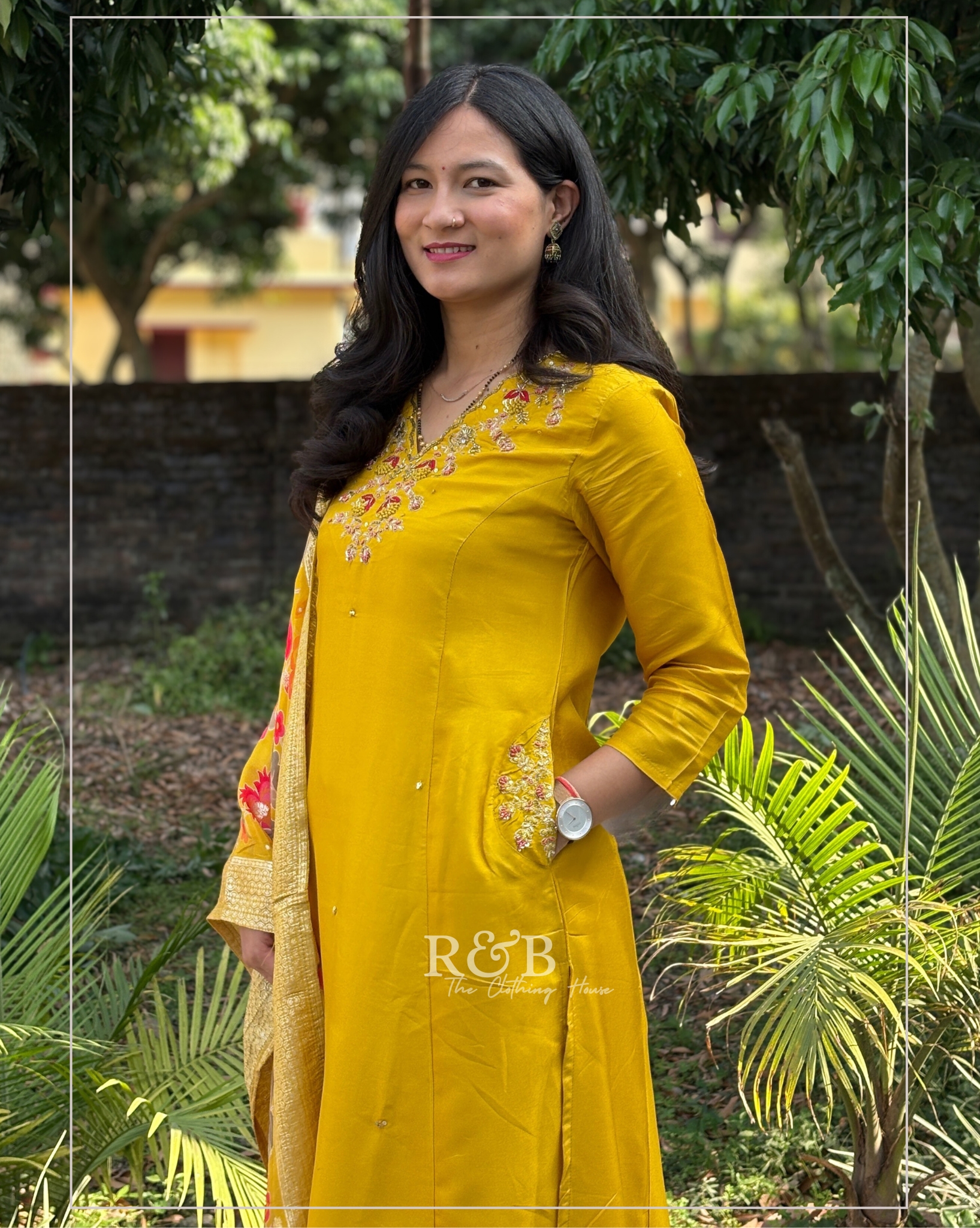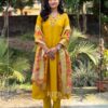 A beautiful A-line suit adorned with intricate hand embroidery and functional side pockets, paired with matching pants and a stunning Jacquard Banarasi woven dupatta. A perfect choice for festive occasions.