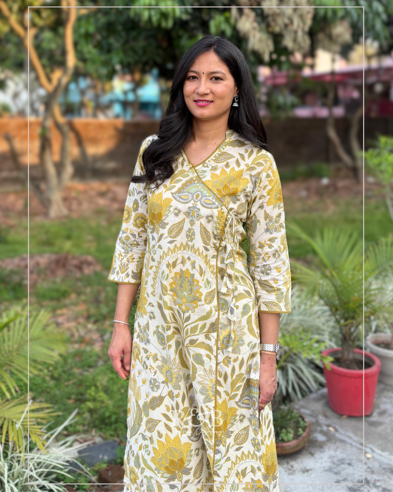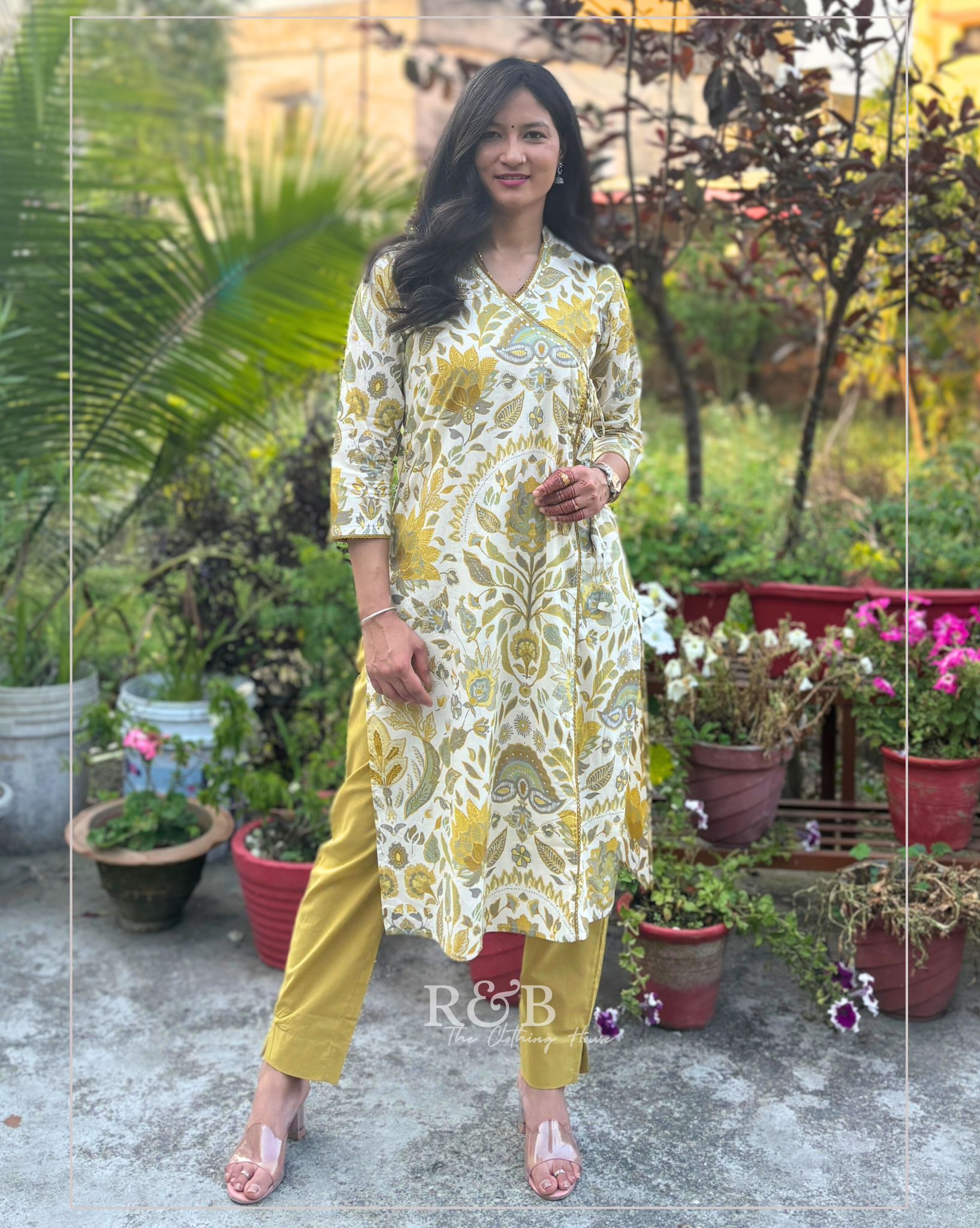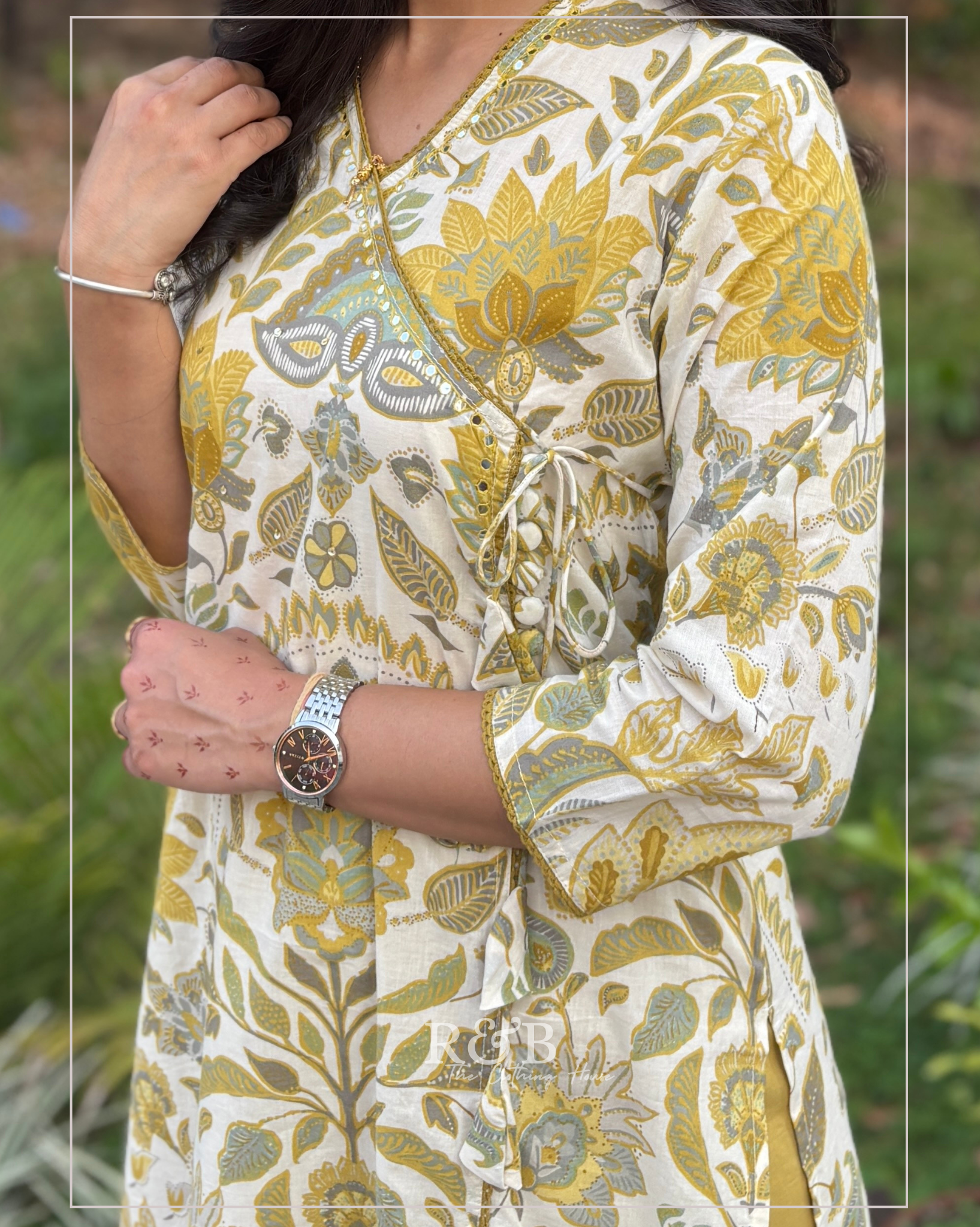 + Free ShippingFloral printed cotton angarakha kurta pant set features a vibrant kurta adorned with delicate floral patterns. The kurta has intricate lace detailing on the neck and side. It is paired along with solid cotton pant for all day comfort. This set is perfect for casual and office look.