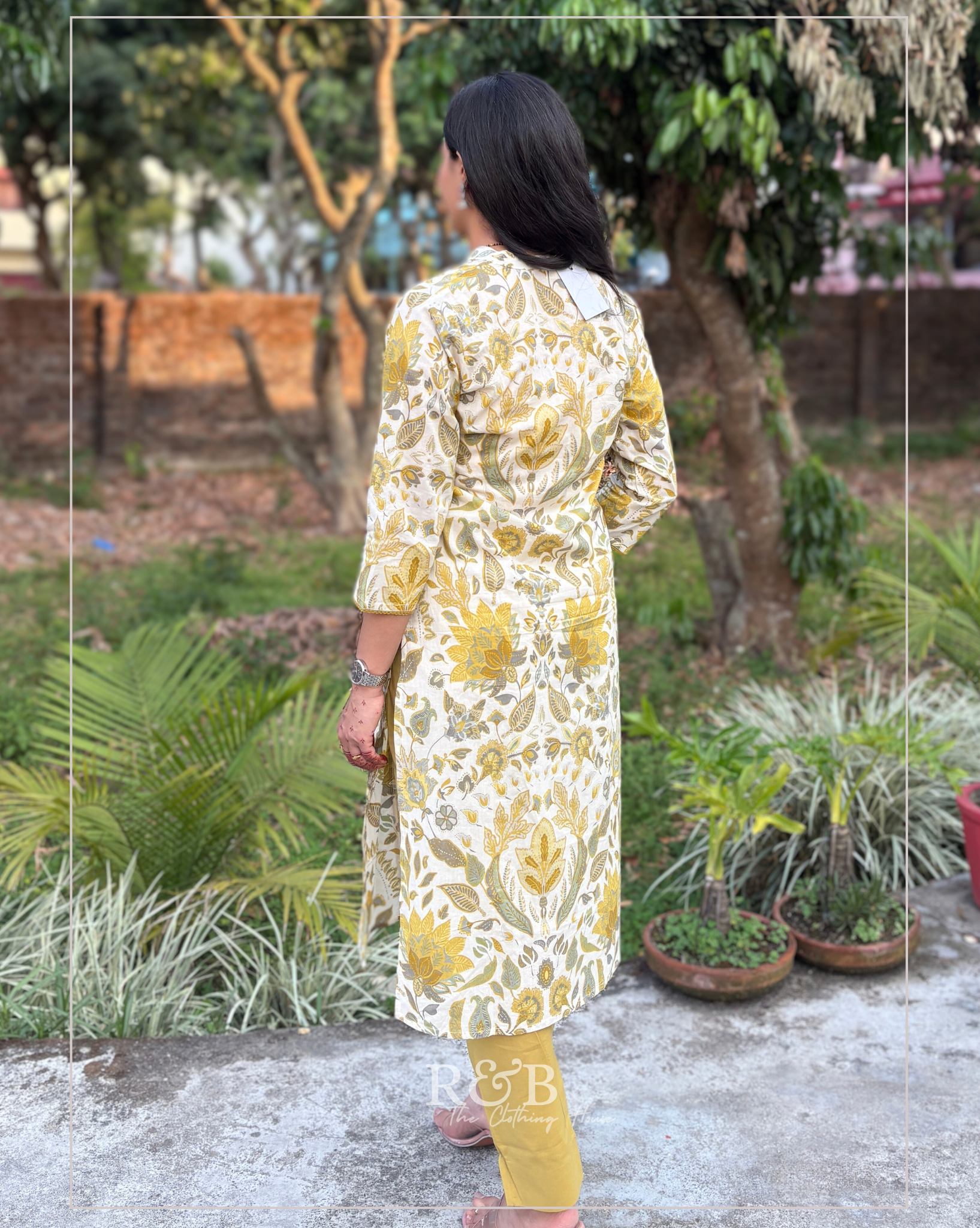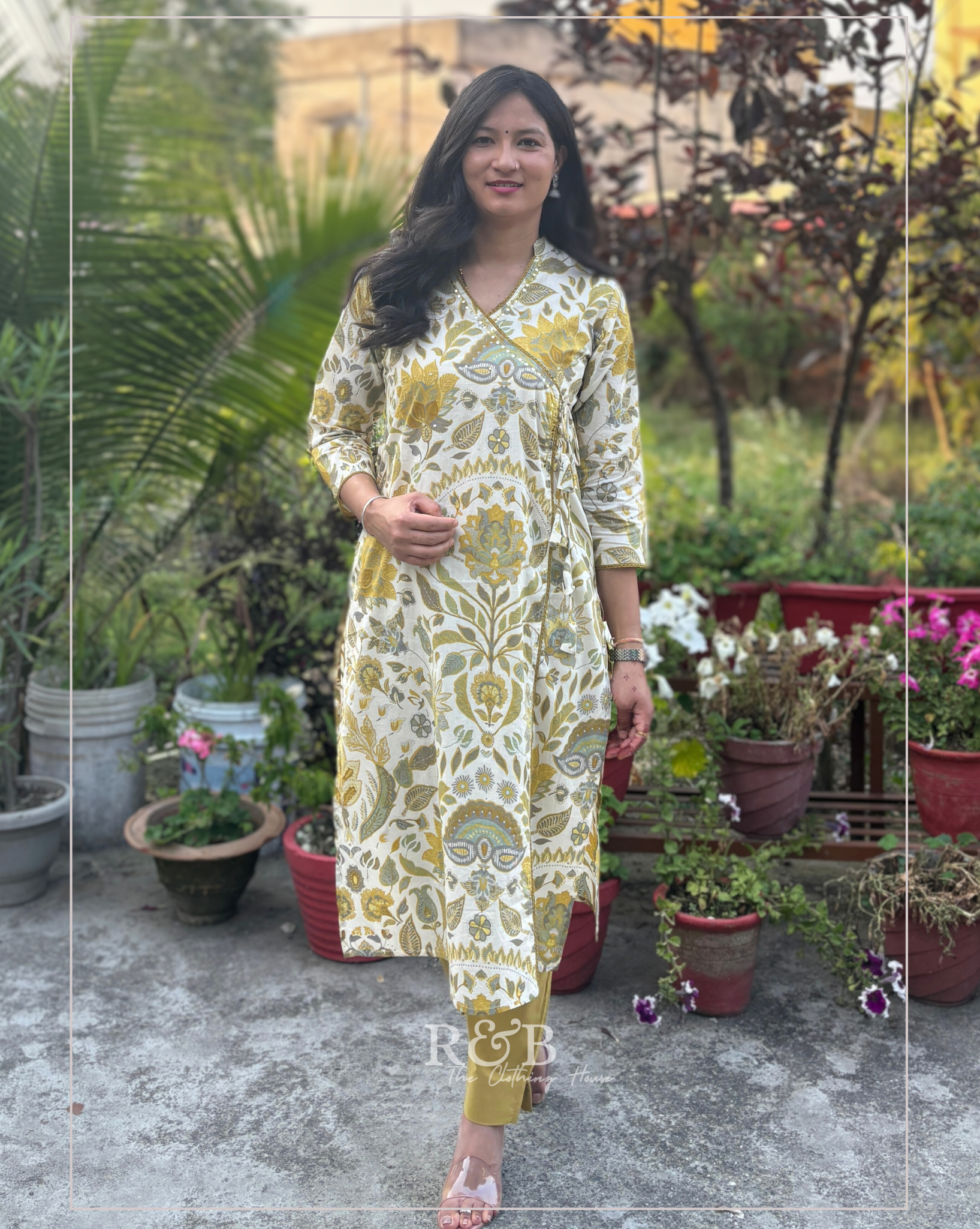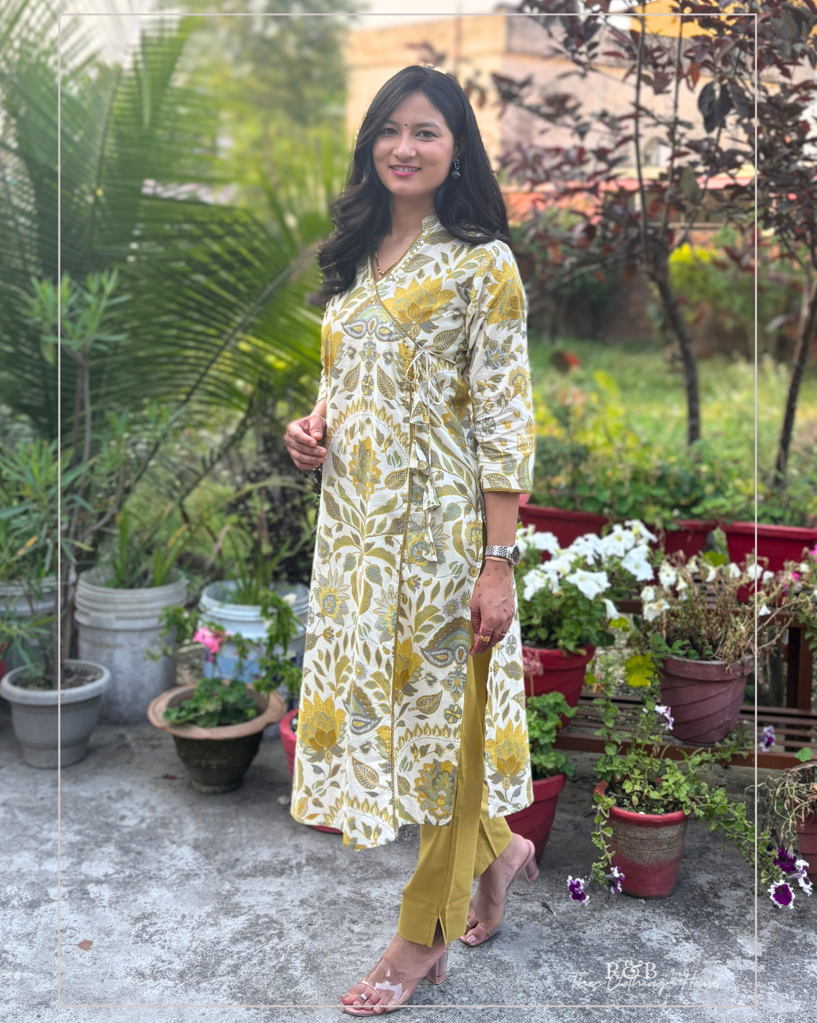 + Free ShippingFloral printed cotton angarakha kurta pant set features a vibrant kurta adorned with delicate floral patterns. The kurta has intricate lace detailing on the neck and side. It is paired along with solid cotton pant for all day comfort. This set is perfect for casual and office look.