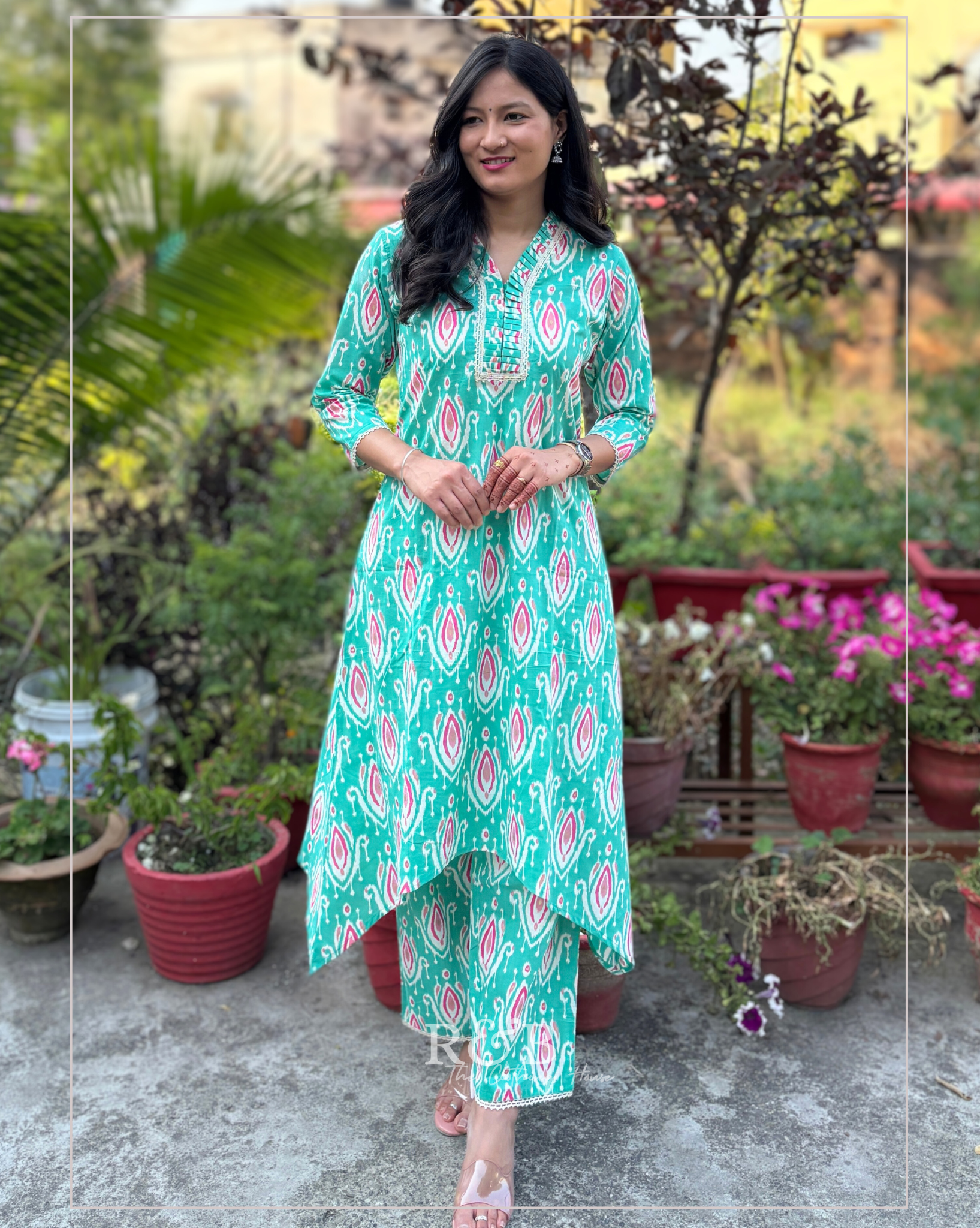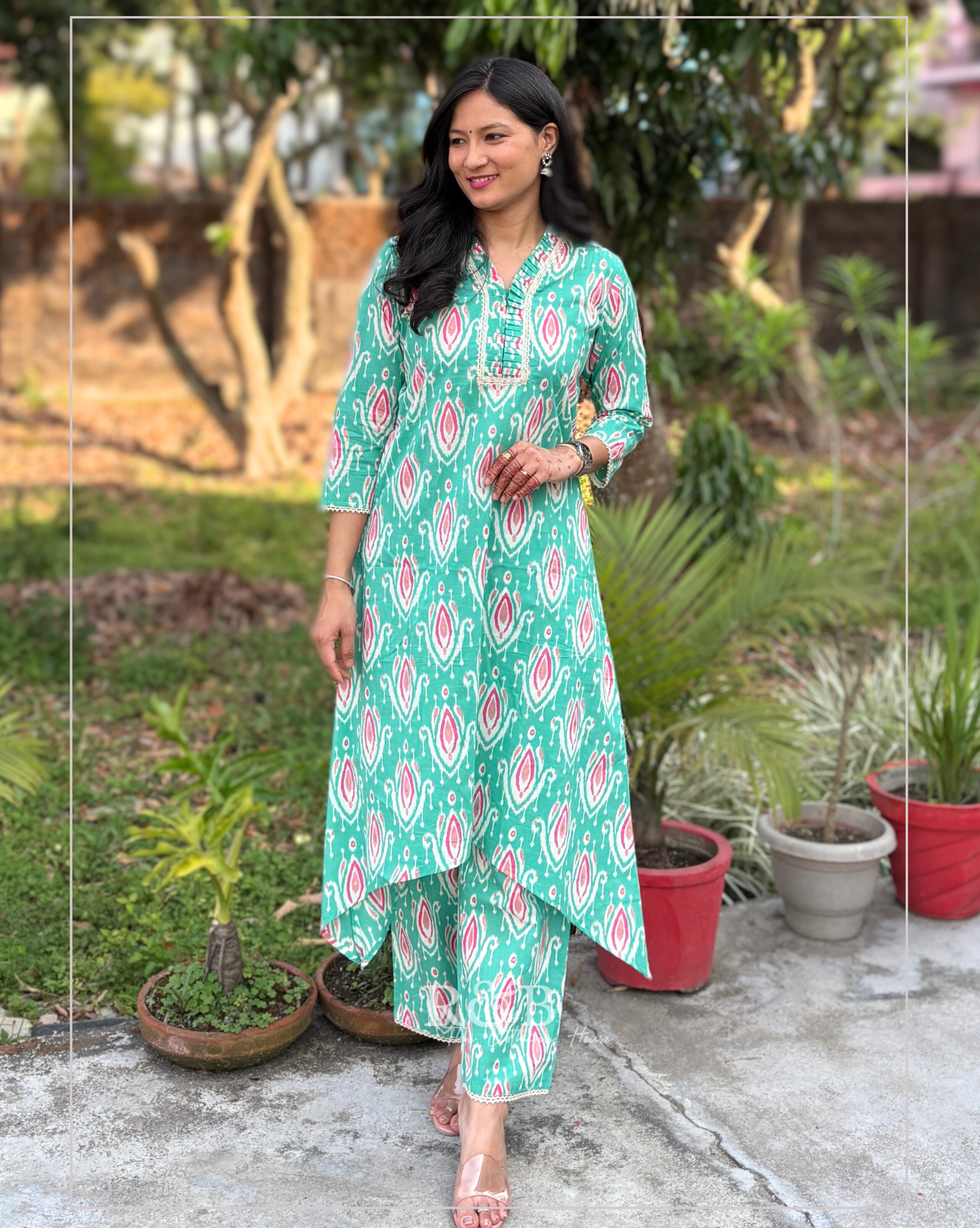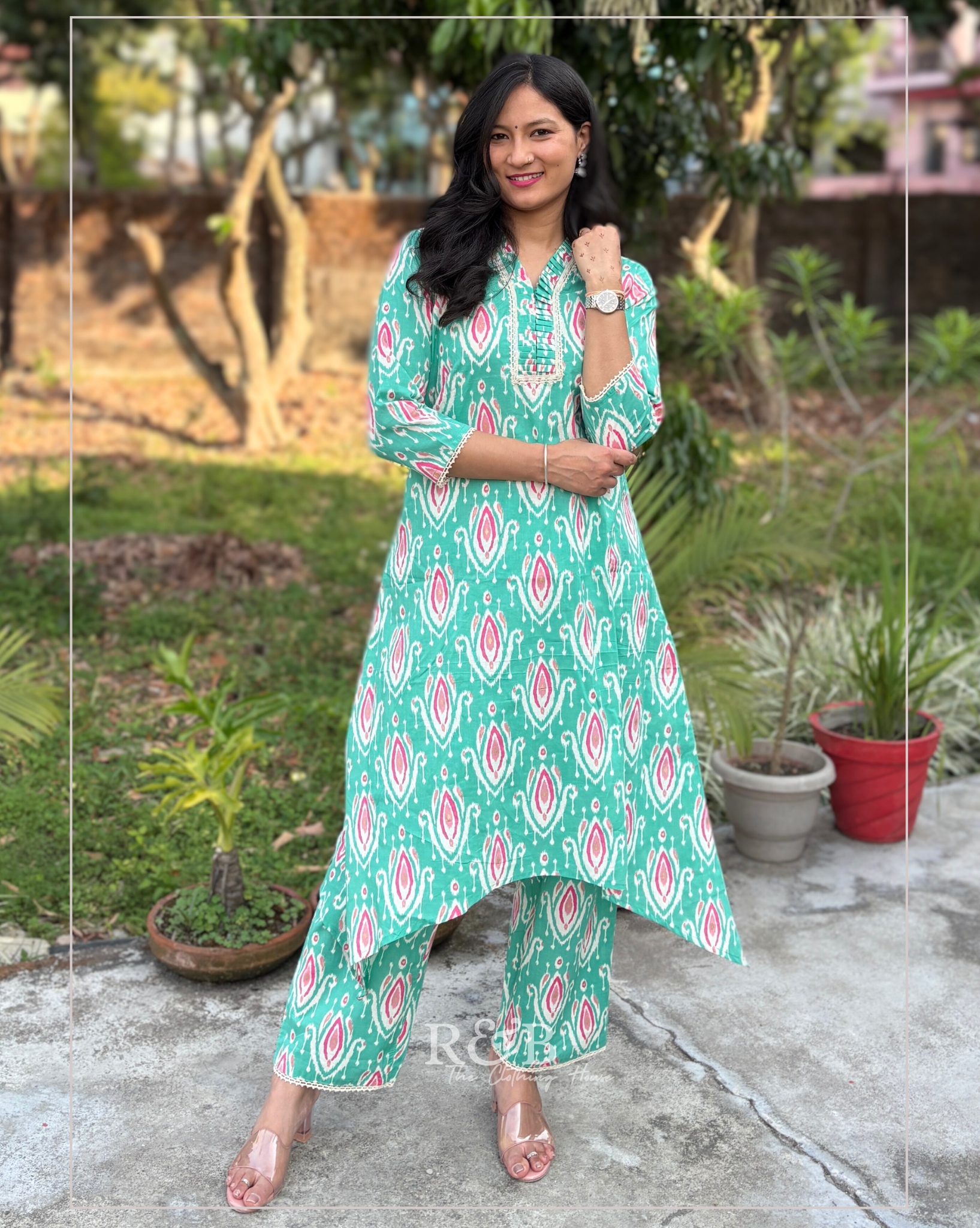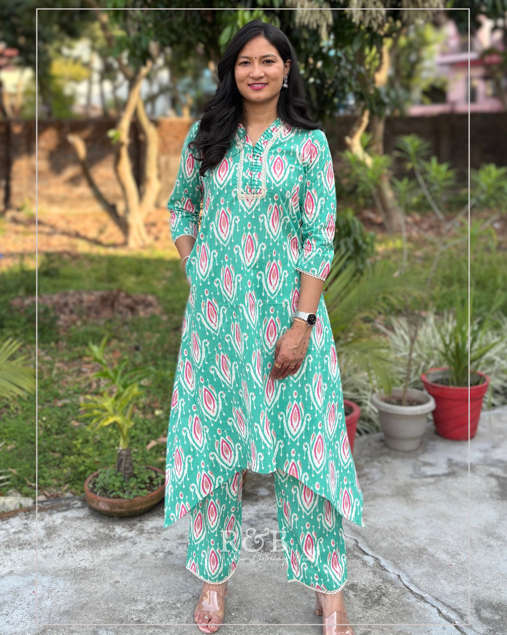 + Free Shipping“Cotton Ikat cord set featuring a stylish C-cut shape, delicate gathers and pleating at the neck, finished with elegant lace detailing.”