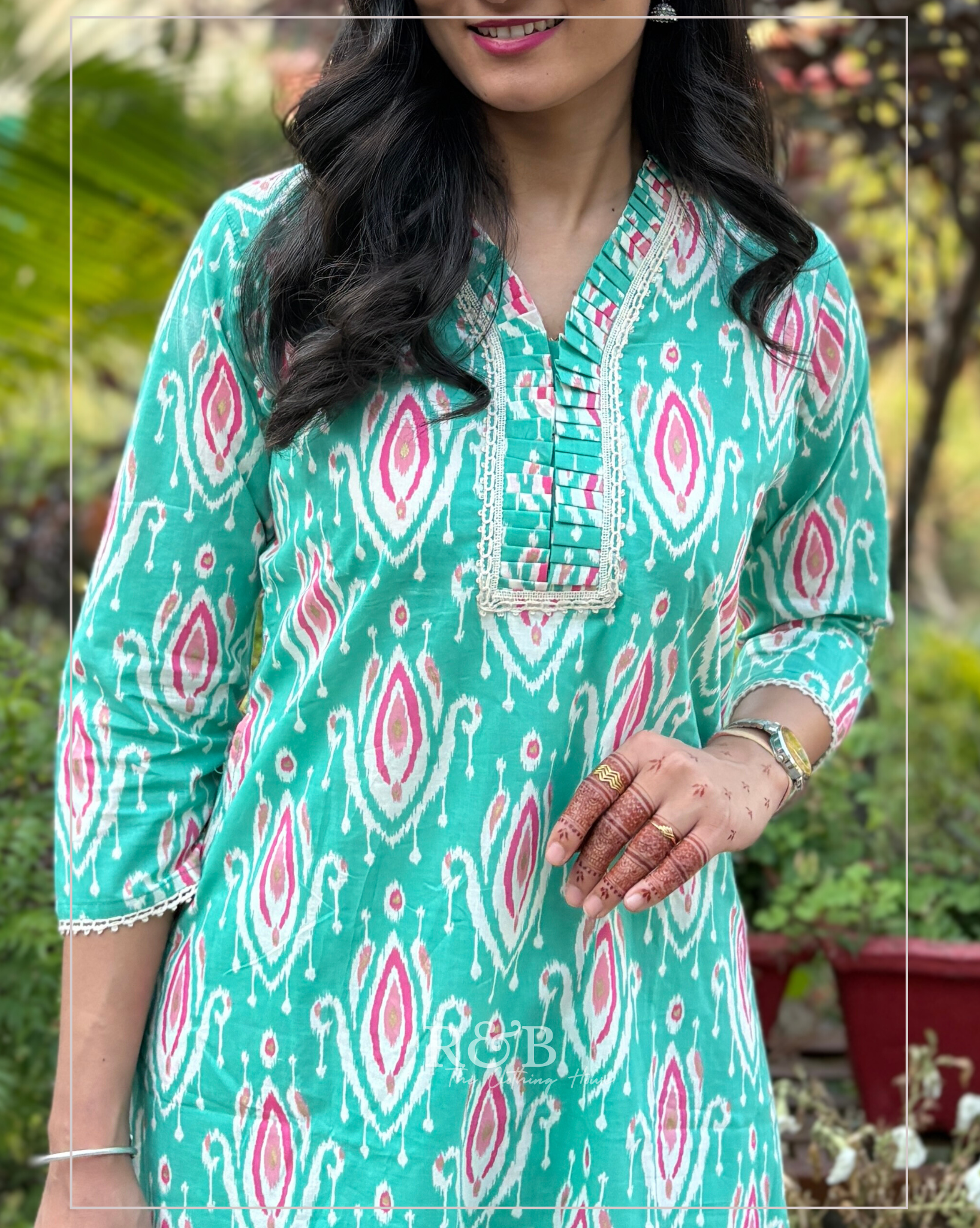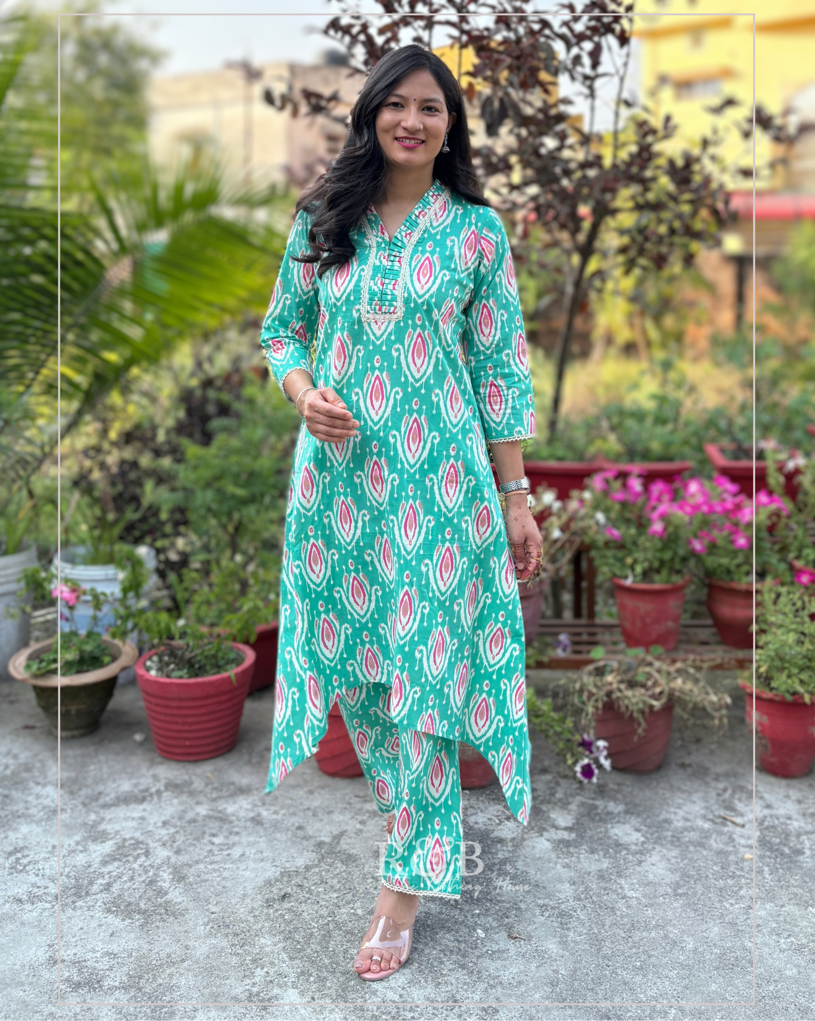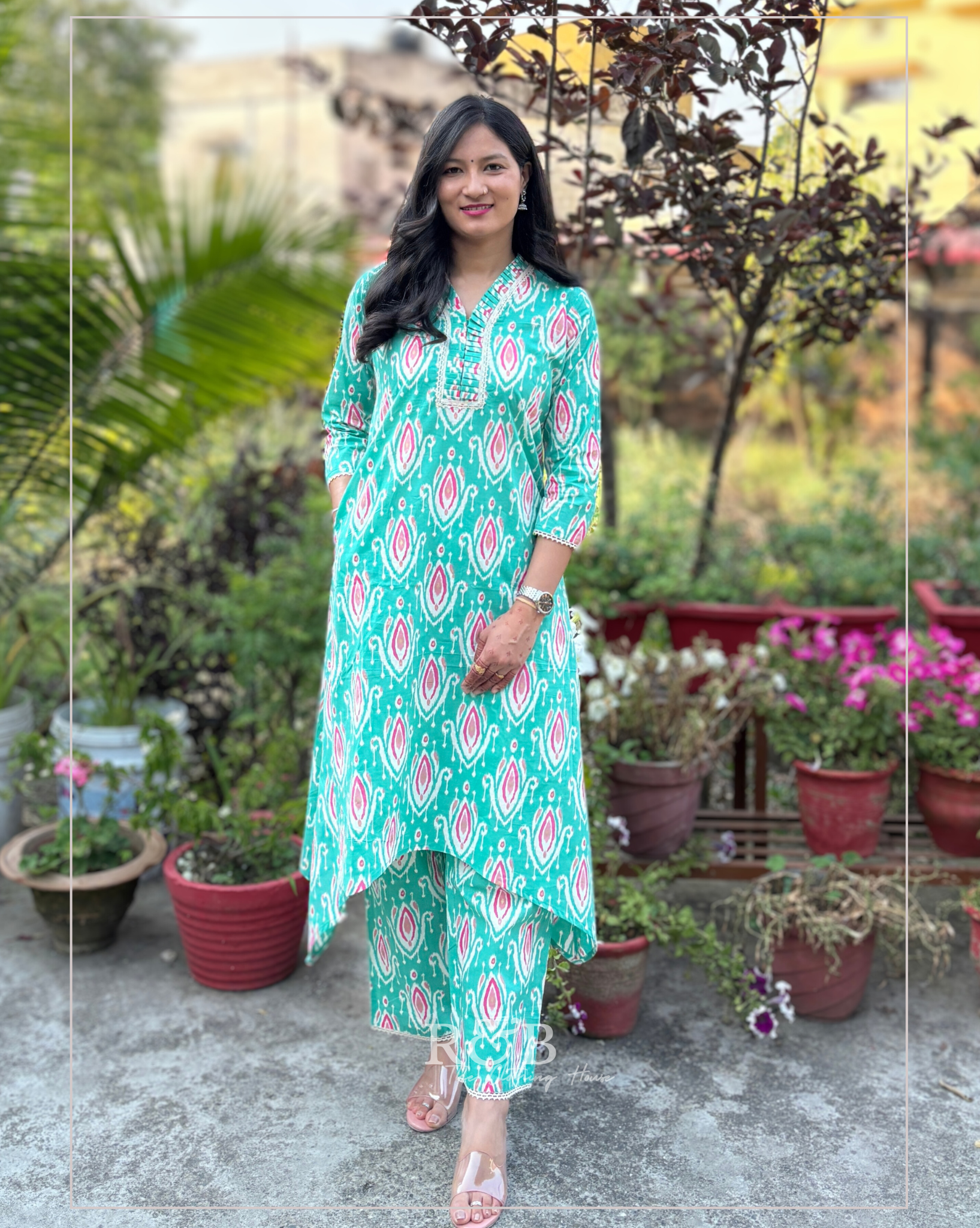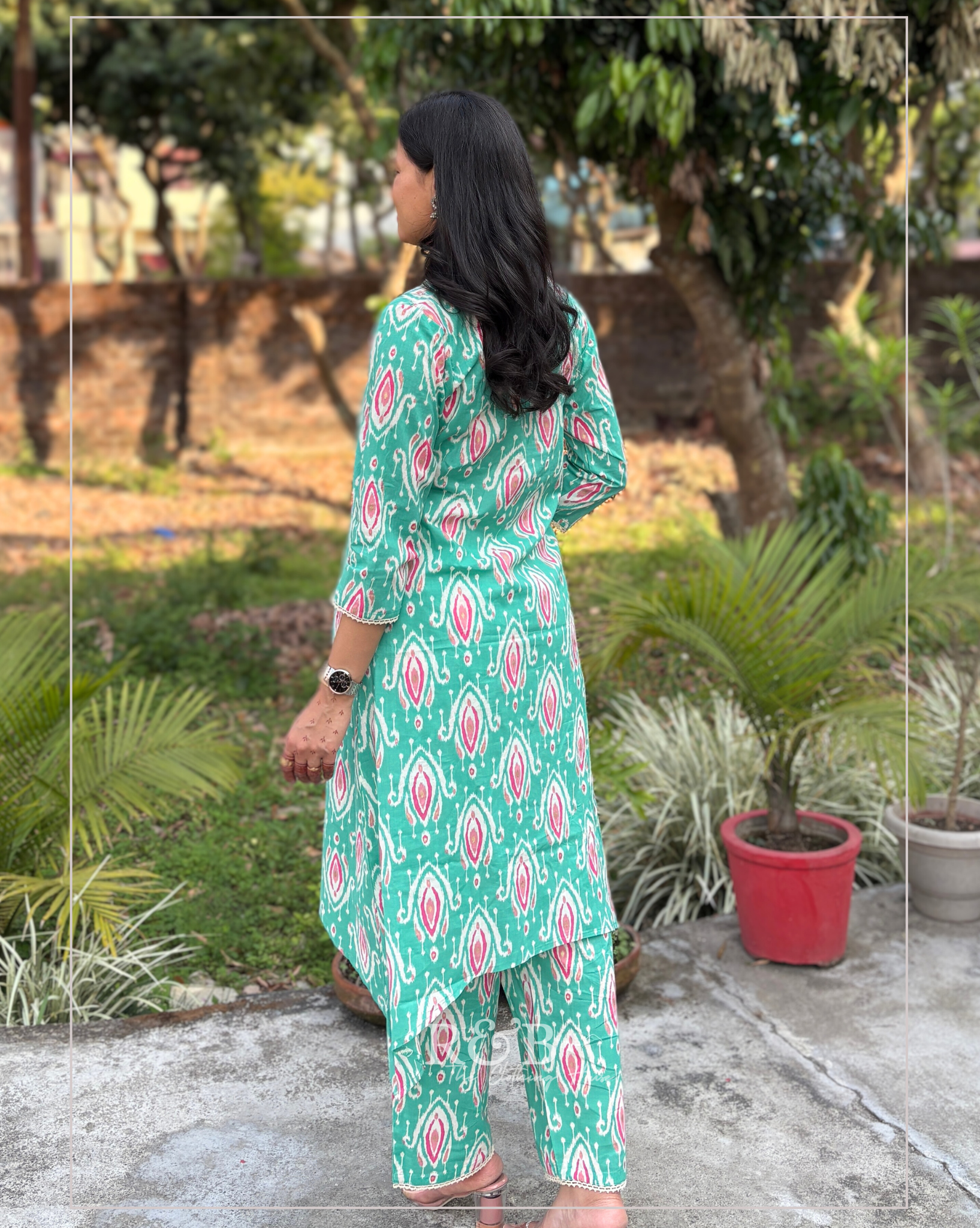 + Free Shipping“Cotton Ikat cord set featuring a stylish C-cut shape, delicate gathers and pleating at the neck, finished with elegant lace detailing.”
