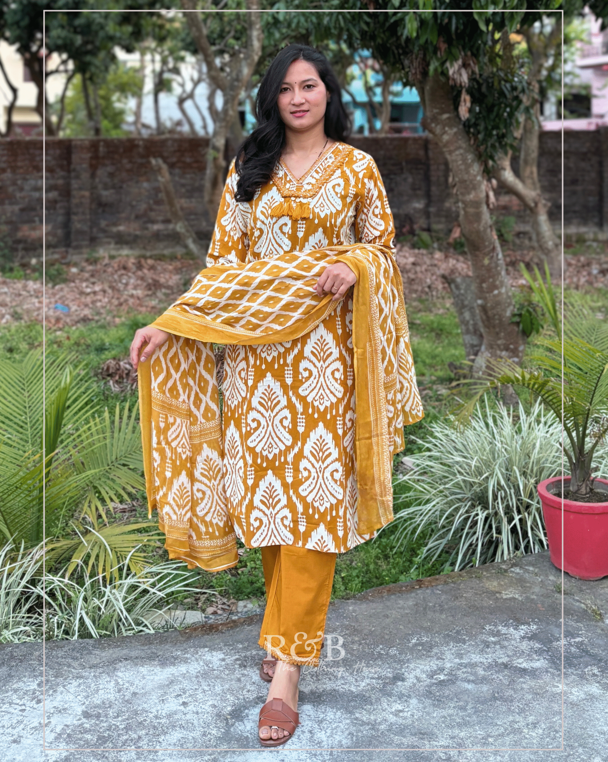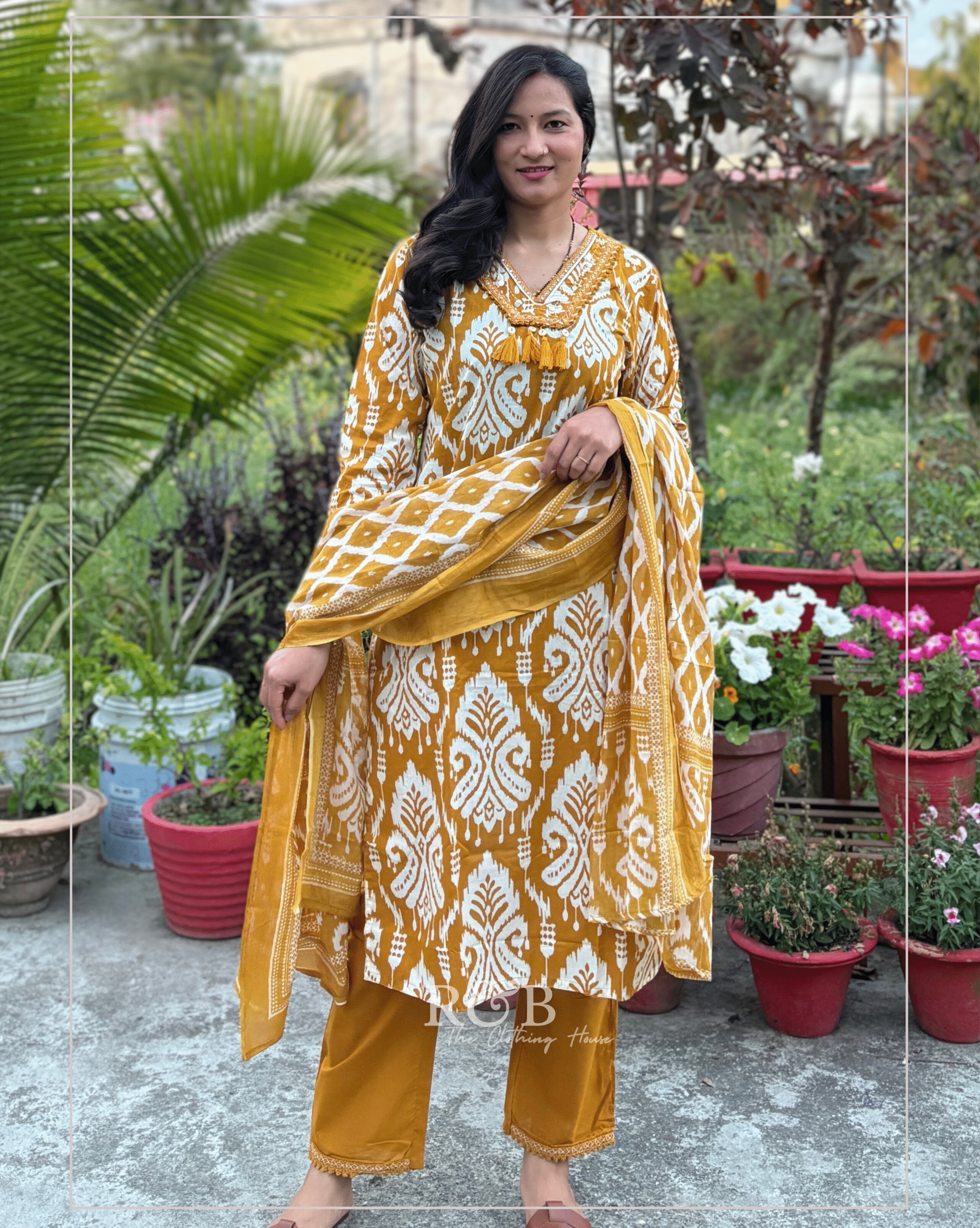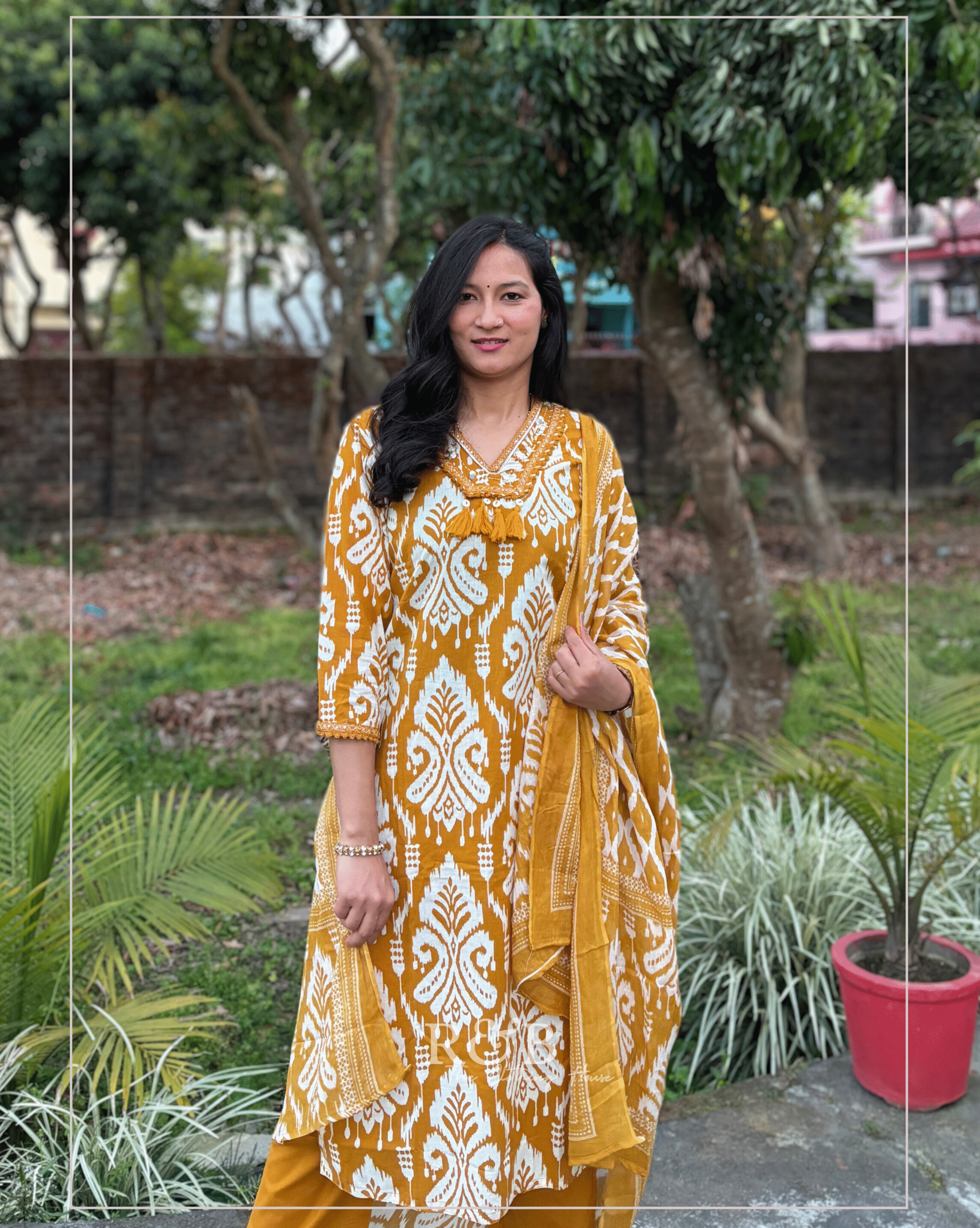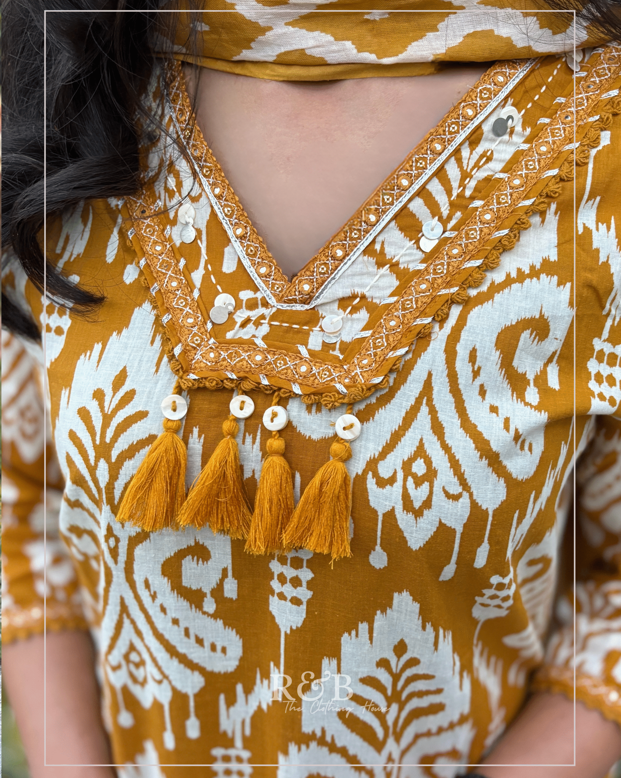 + Free ShippingCotton Ikat print suit set with V-neck tassel detailing, paired with a solid pant and matching dupatta.