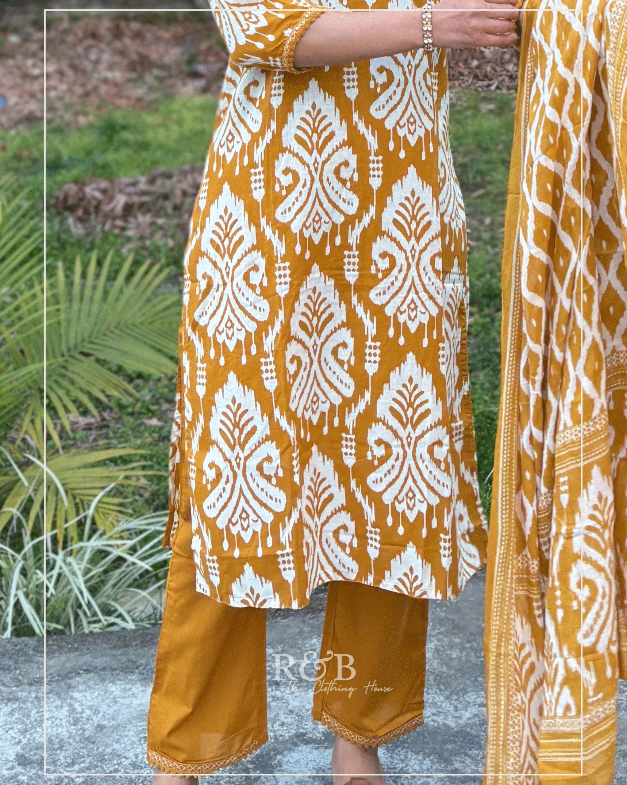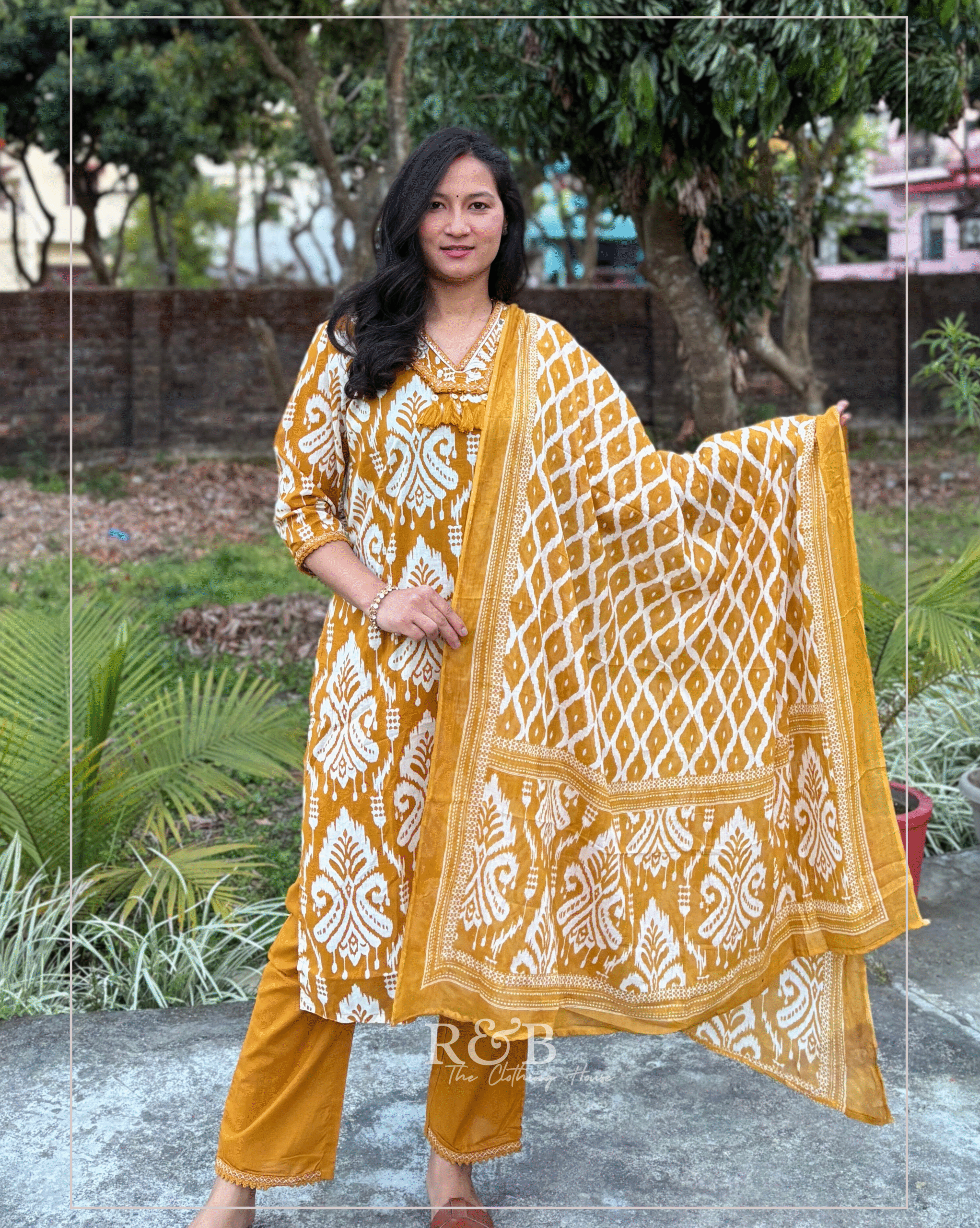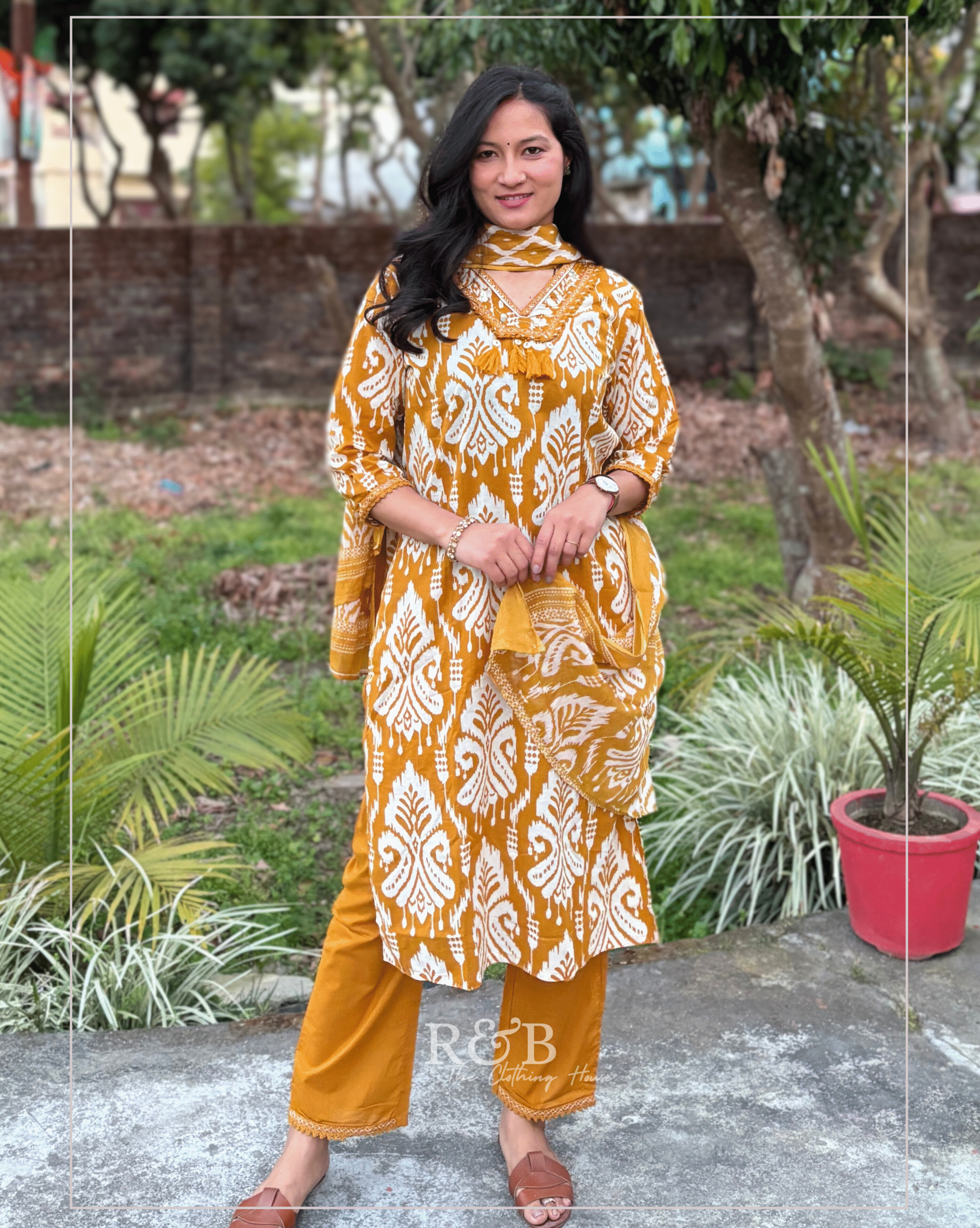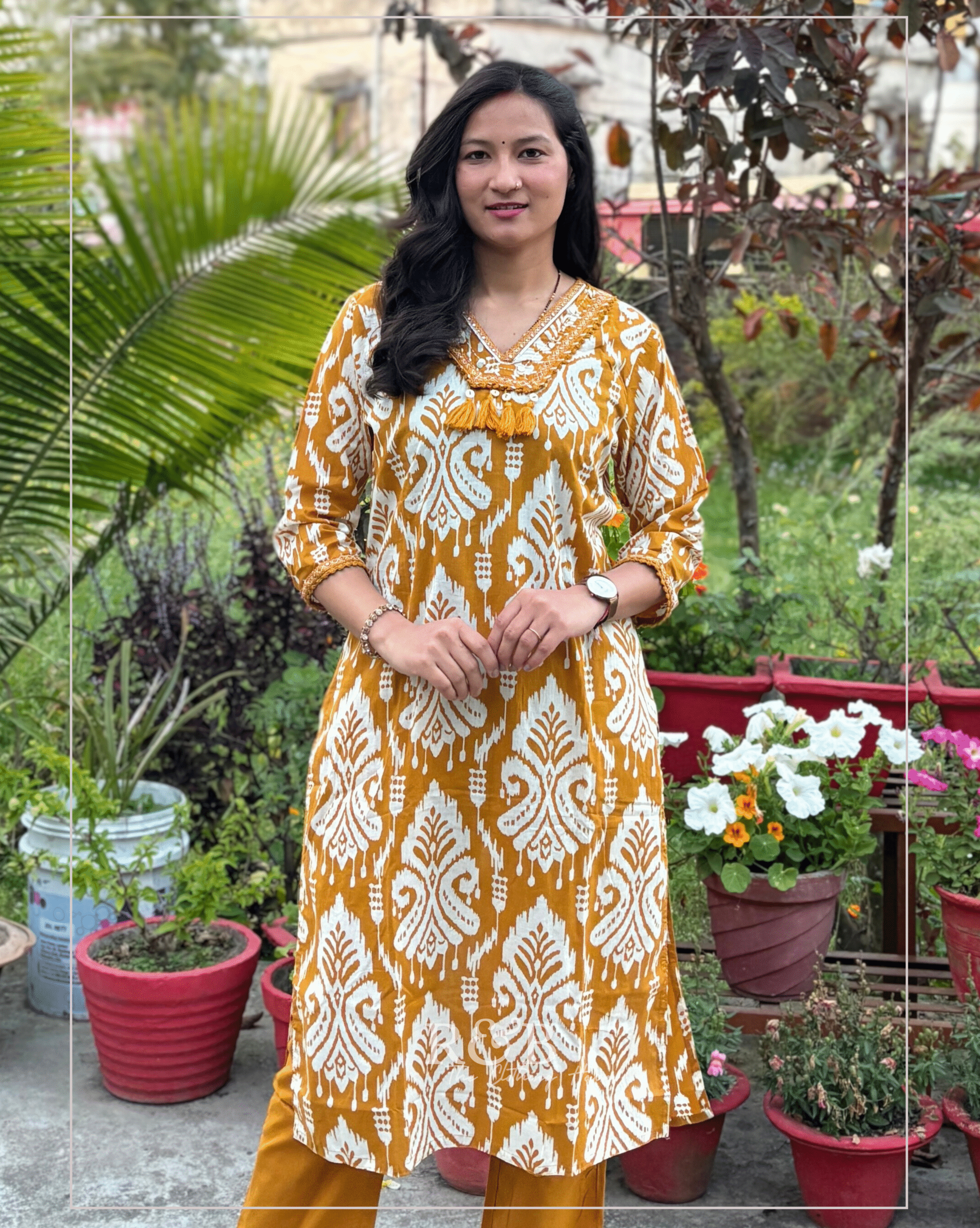 + Free ShippingCotton Ikat print suit set with V-neck tassel detailing, paired with a solid pant and matching dupatta.