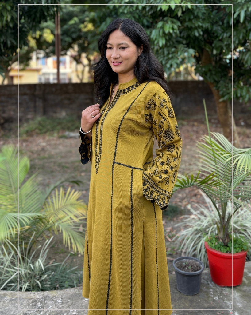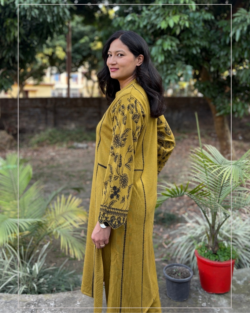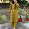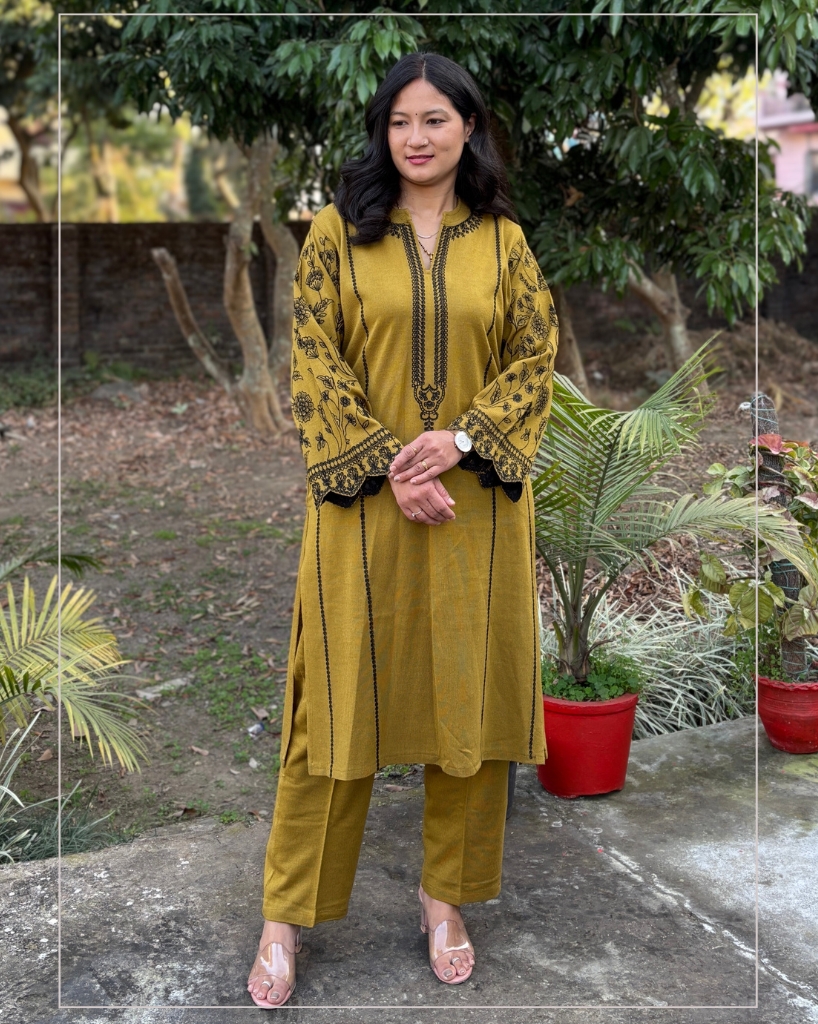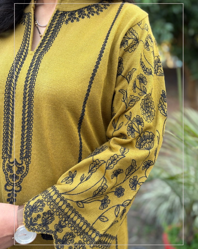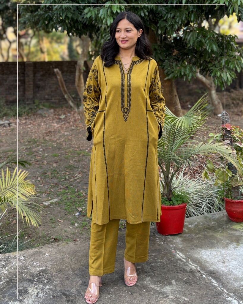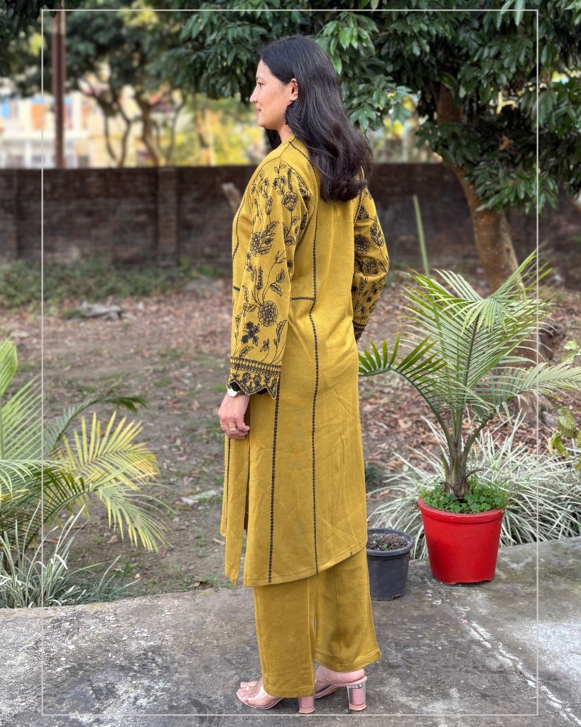 + Free ShippingMustard Woollen Co-ord Set featuring floral embroidery on the sleeves and functional pockets on both sides. Warm, comfortable, stylish and a perfect addition to your winter wardrobe.
