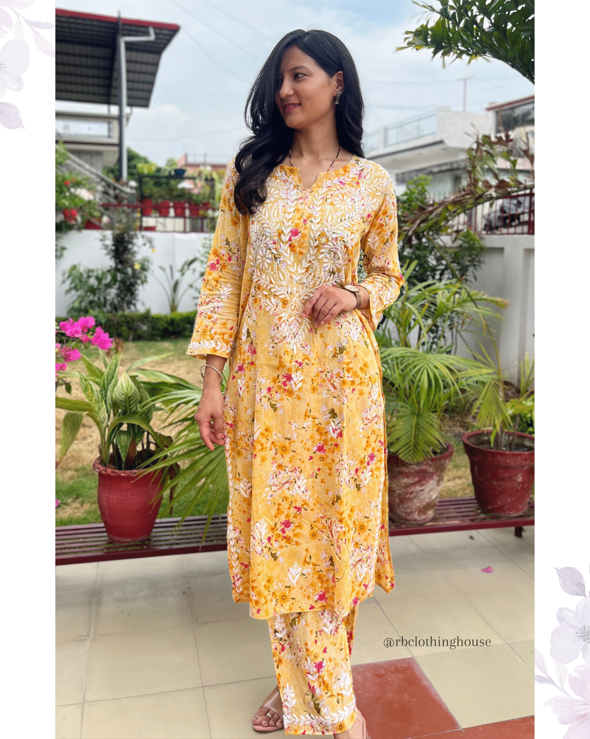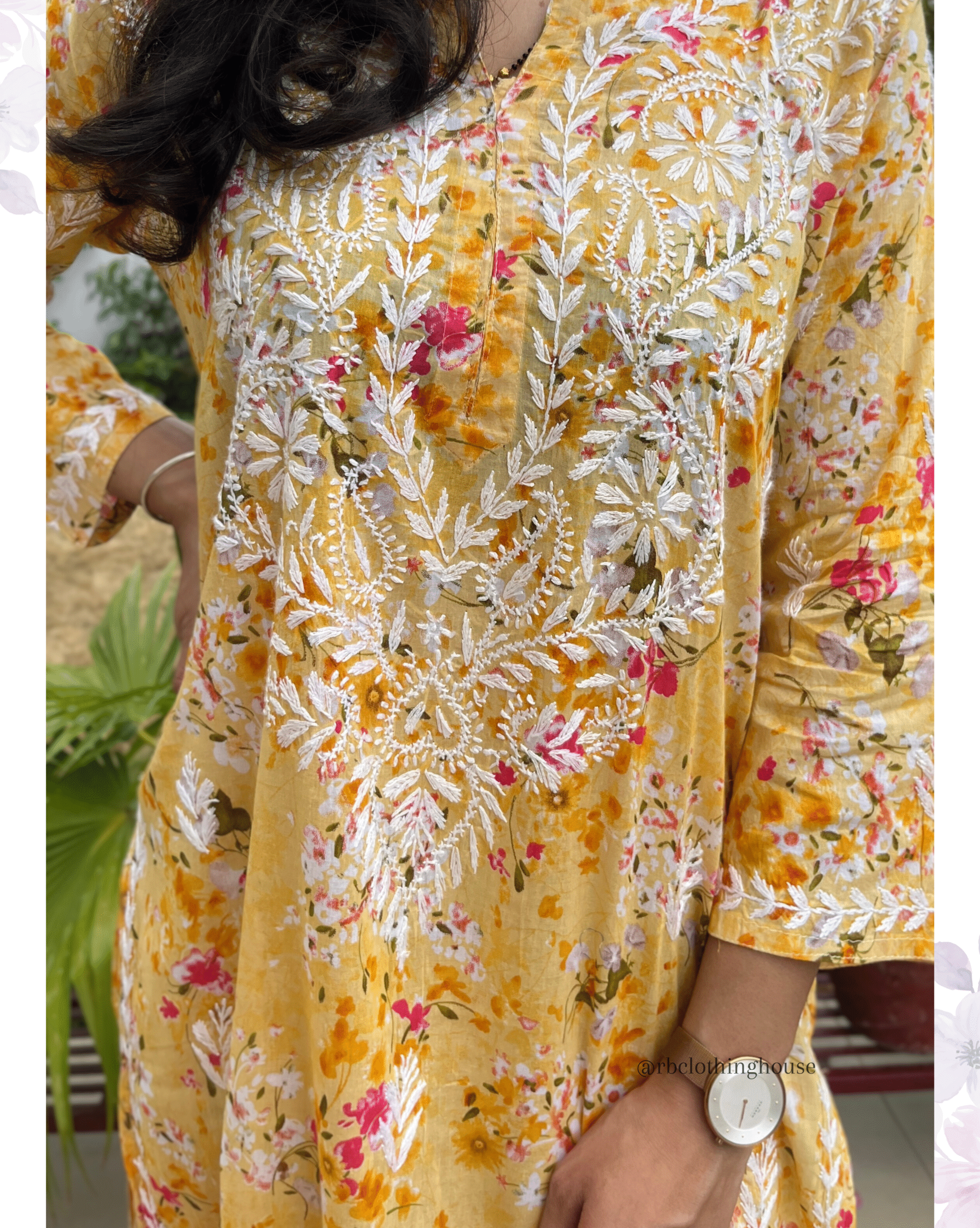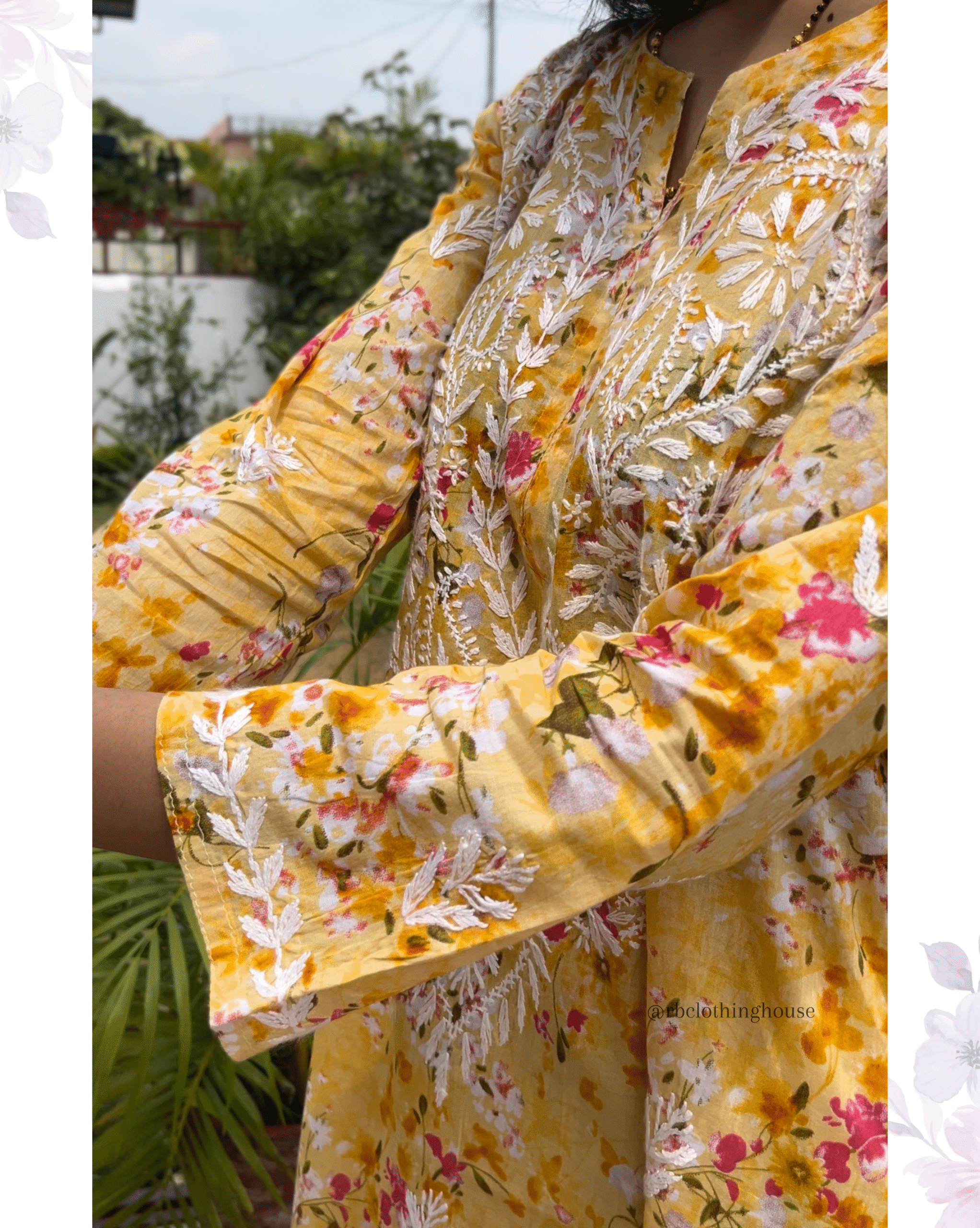 Super comfy printed mul cotton kurta pant set, with hand embroidery. Essential piece for office wear/casual wear.