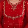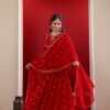 + Free ShippingGraceful red georgette Anarkali with golden front neck embroidery, styled with palazzo and a matching dupatta.
