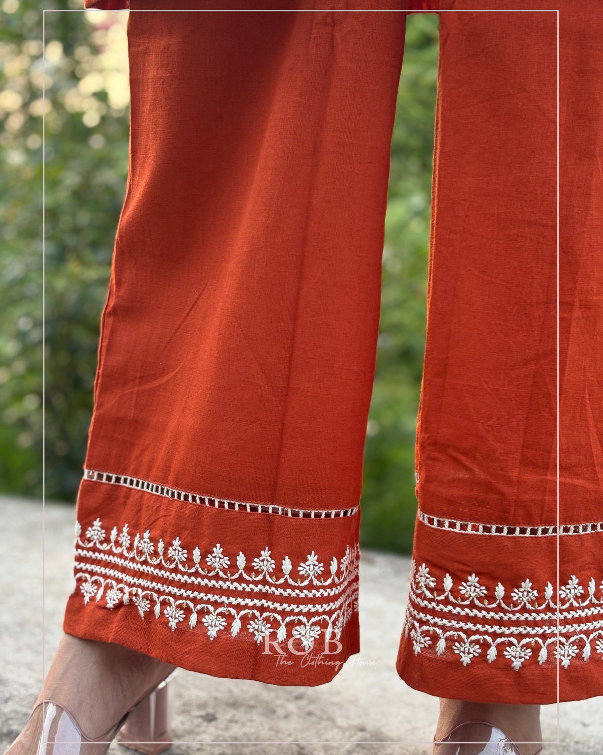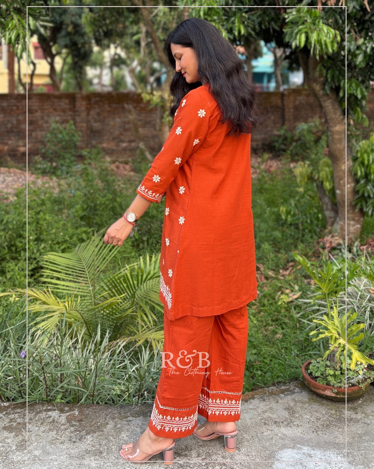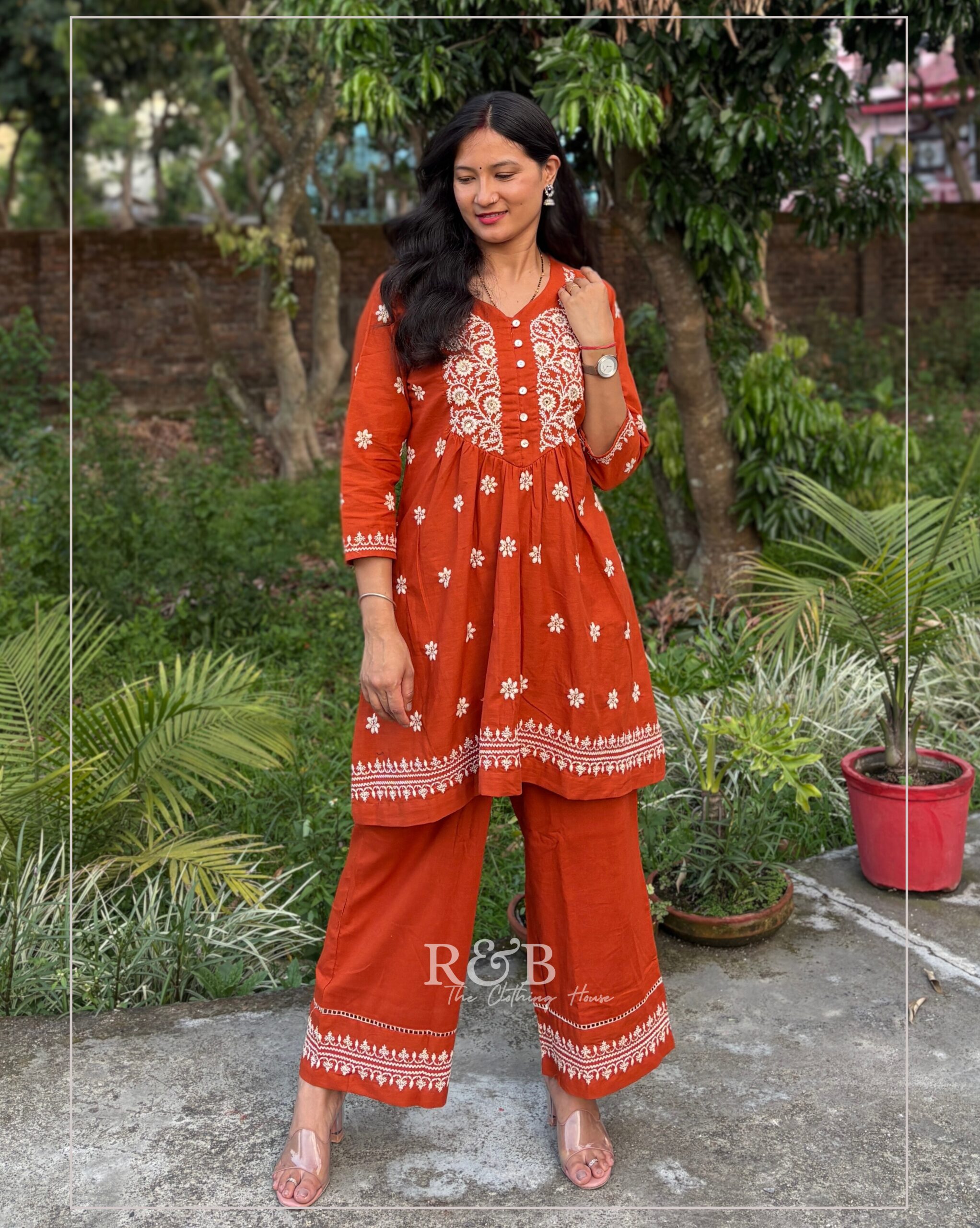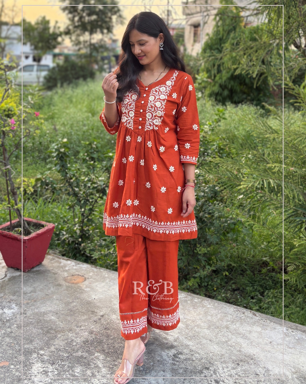 This burnt rust orange co-ord set includes a short embroidered kurta and matching palazzo pants. Made for both comfort and style, it’s perfect for small functions, festivals, or casual outings.