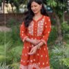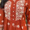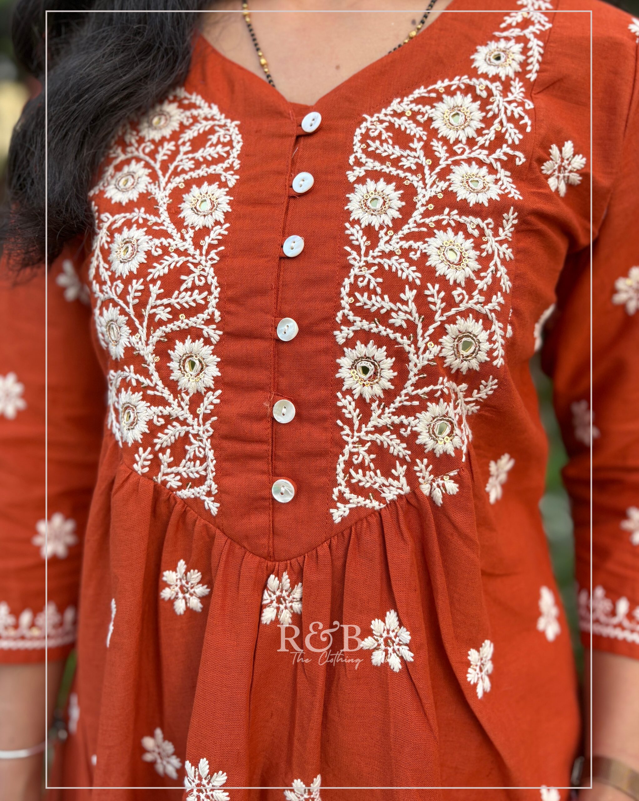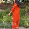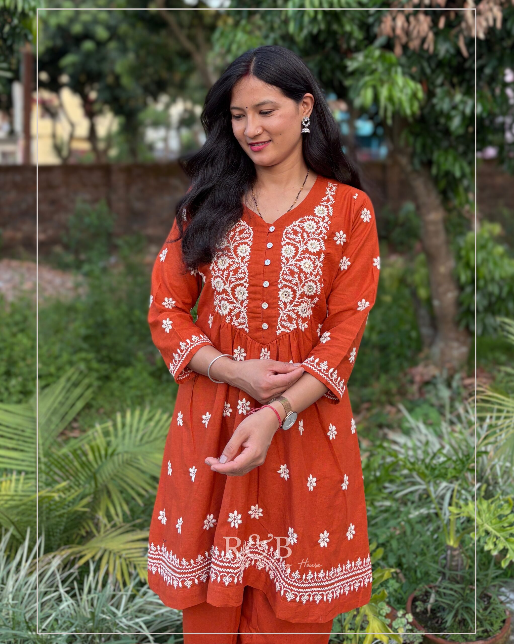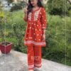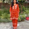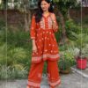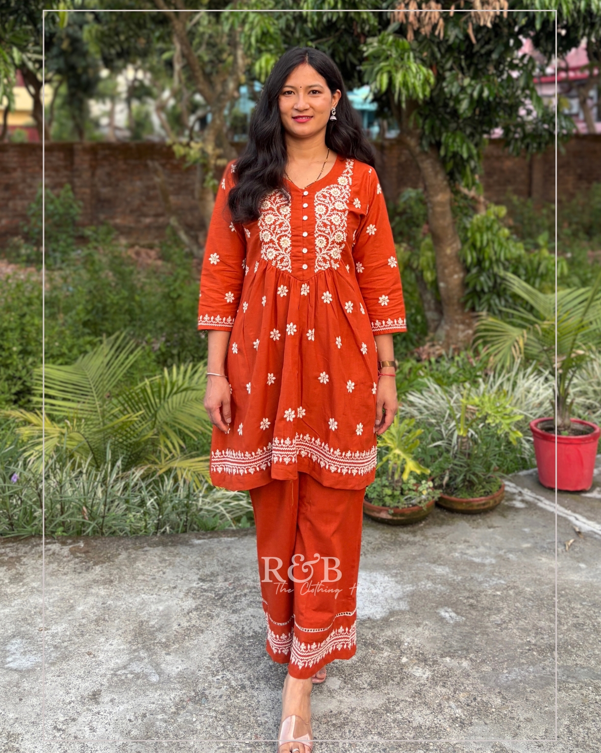 This burnt rust orange co-ord set includes a short embroidered kurta and matching palazzo pants. Made for both comfort and style, it’s perfect for small functions, festivals, or casual outings.