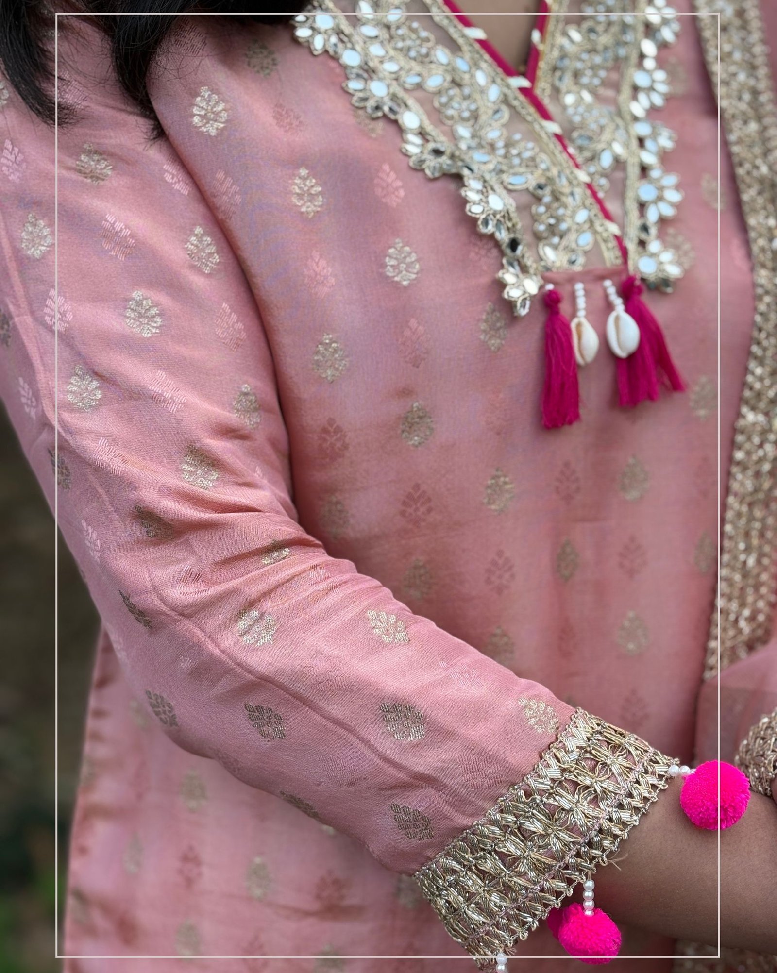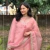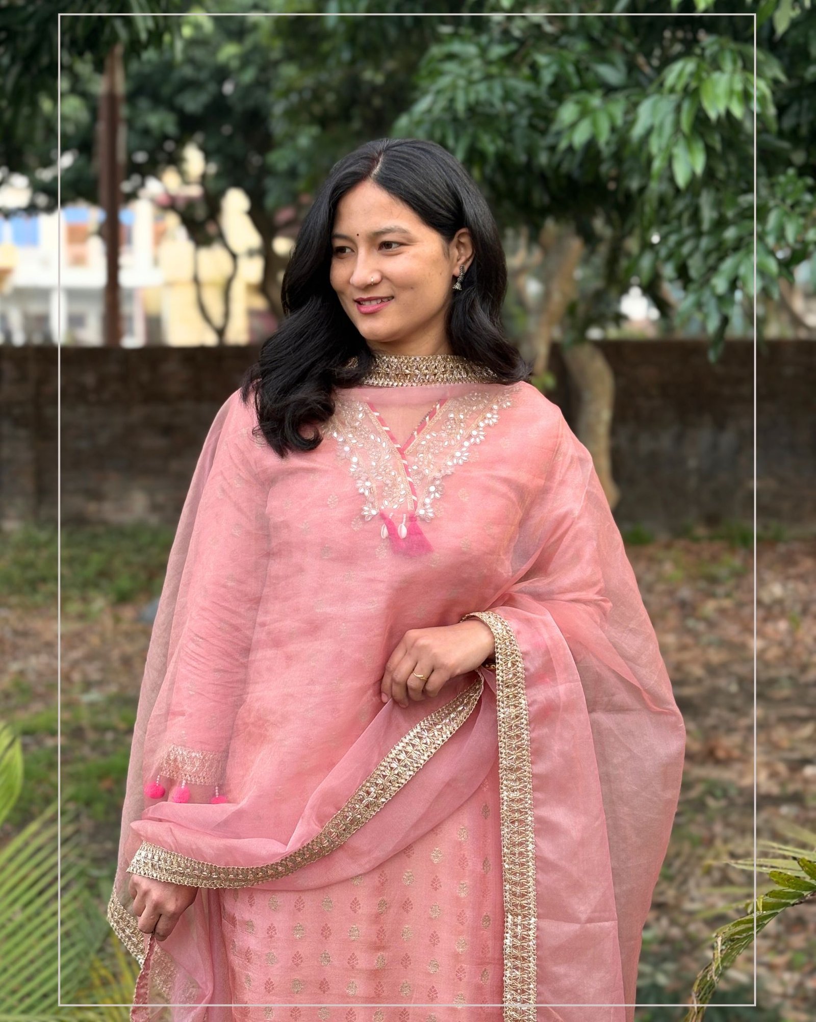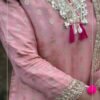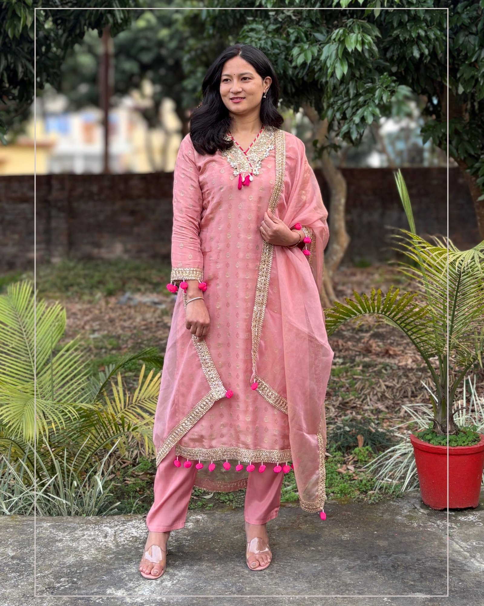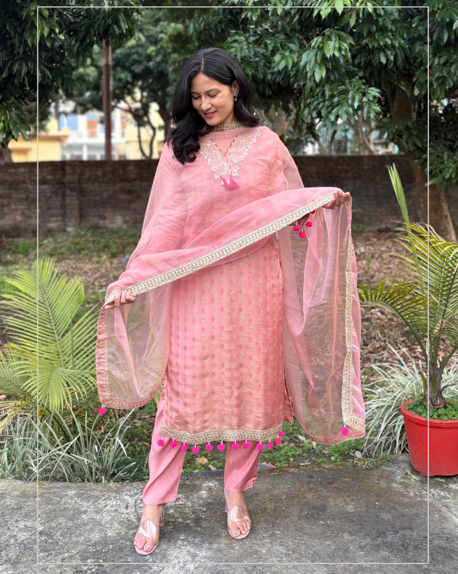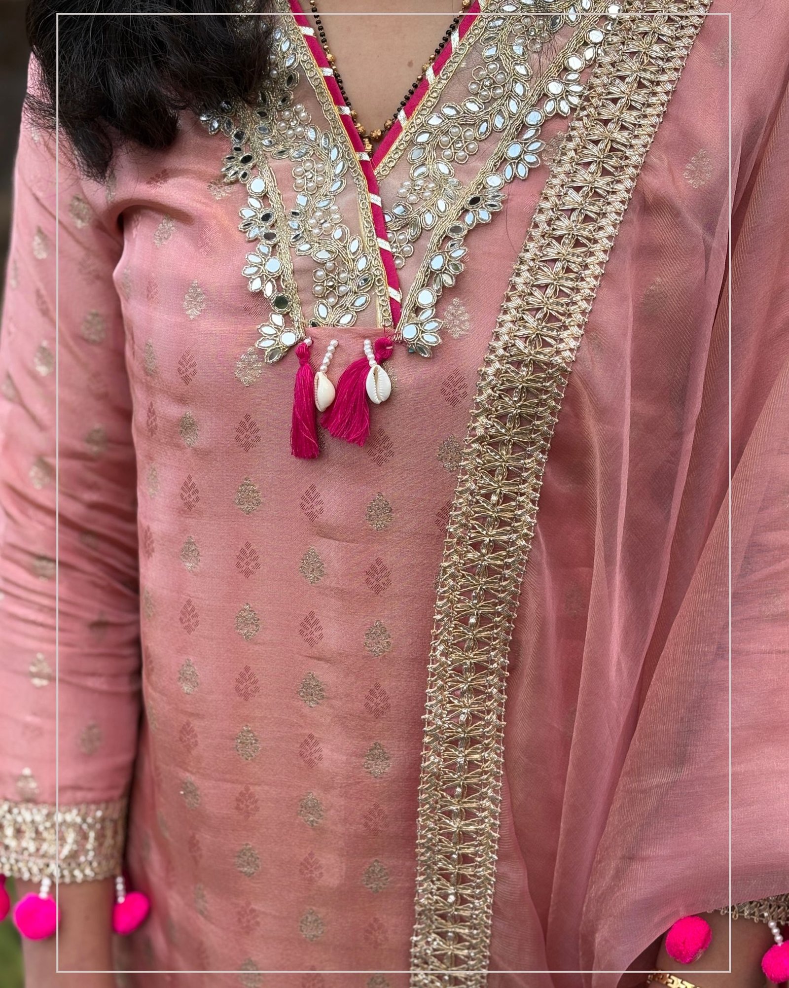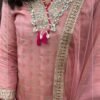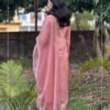 Beautiful peach suit set crafted in shimmer tissue fabric, featuring elegant mirror detailing on the front neckline. Paired with a solid pant and a lightweight organza dupatta for a graceful festive look.
