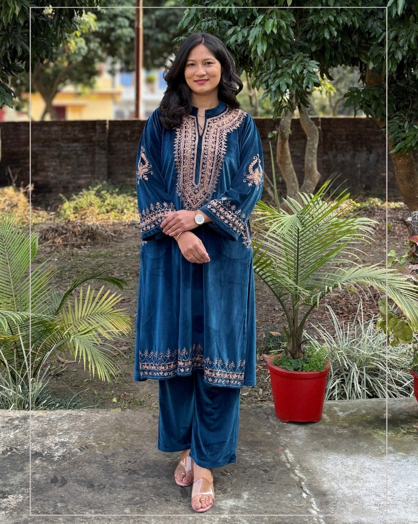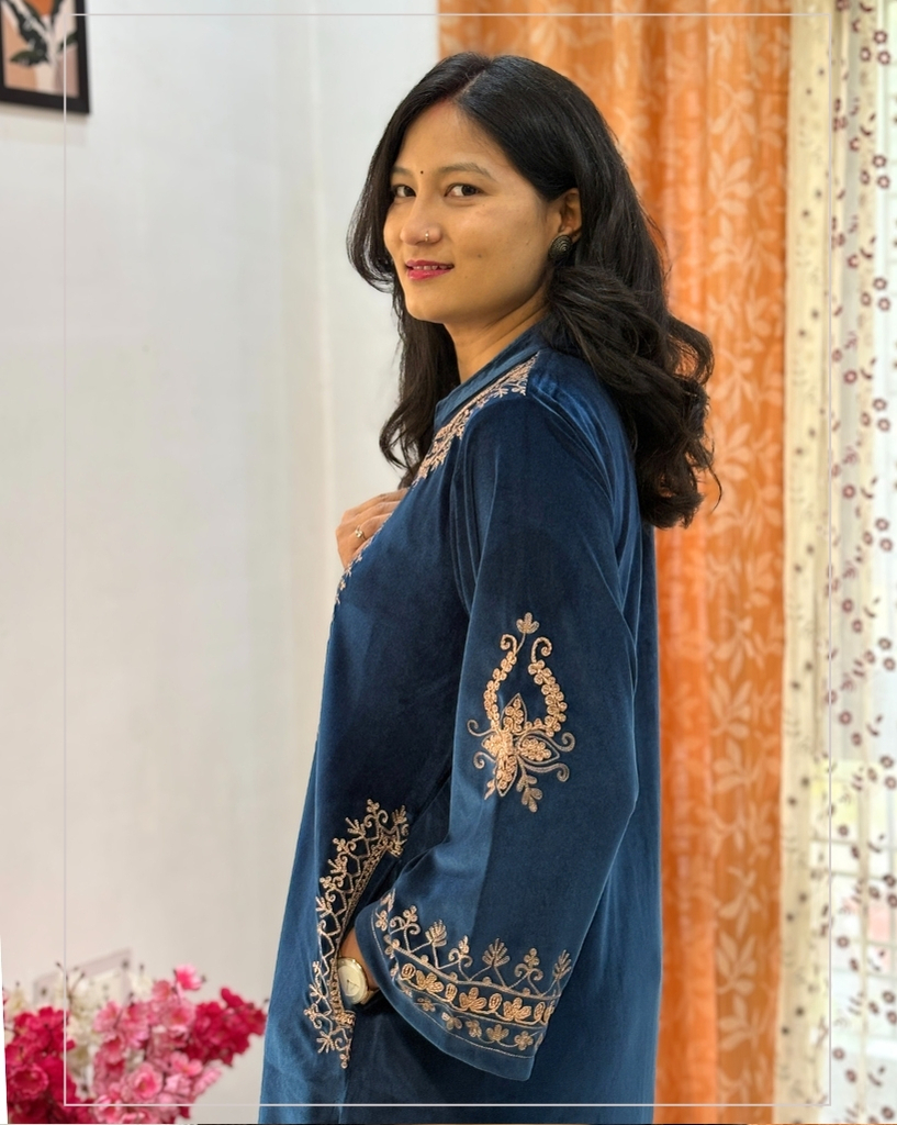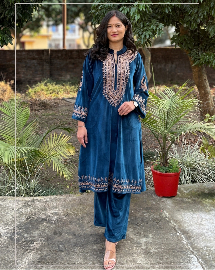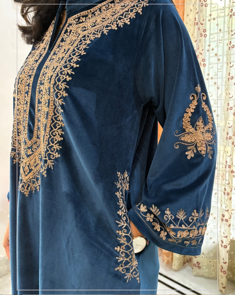 Soft velvet phiran set designed for comfort and warmth. Made from smooth, cozy velvet fabric with pockets on both sides. Perfect for party wear.