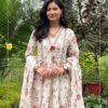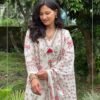 + Free ShippingWhite printed A-line suit set with lace highlights, comfy front pockets, paired with palazzo pants & matching dupatta.