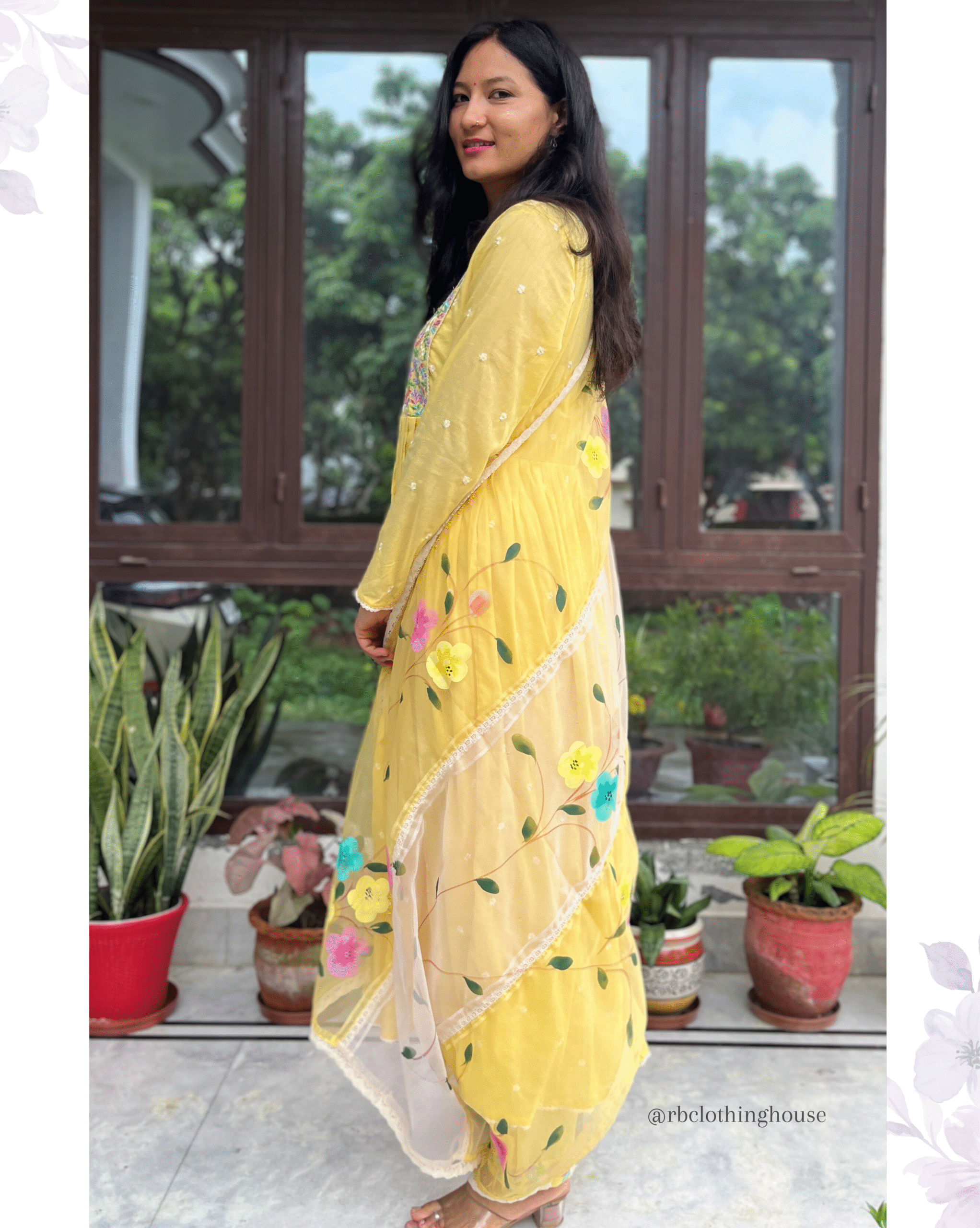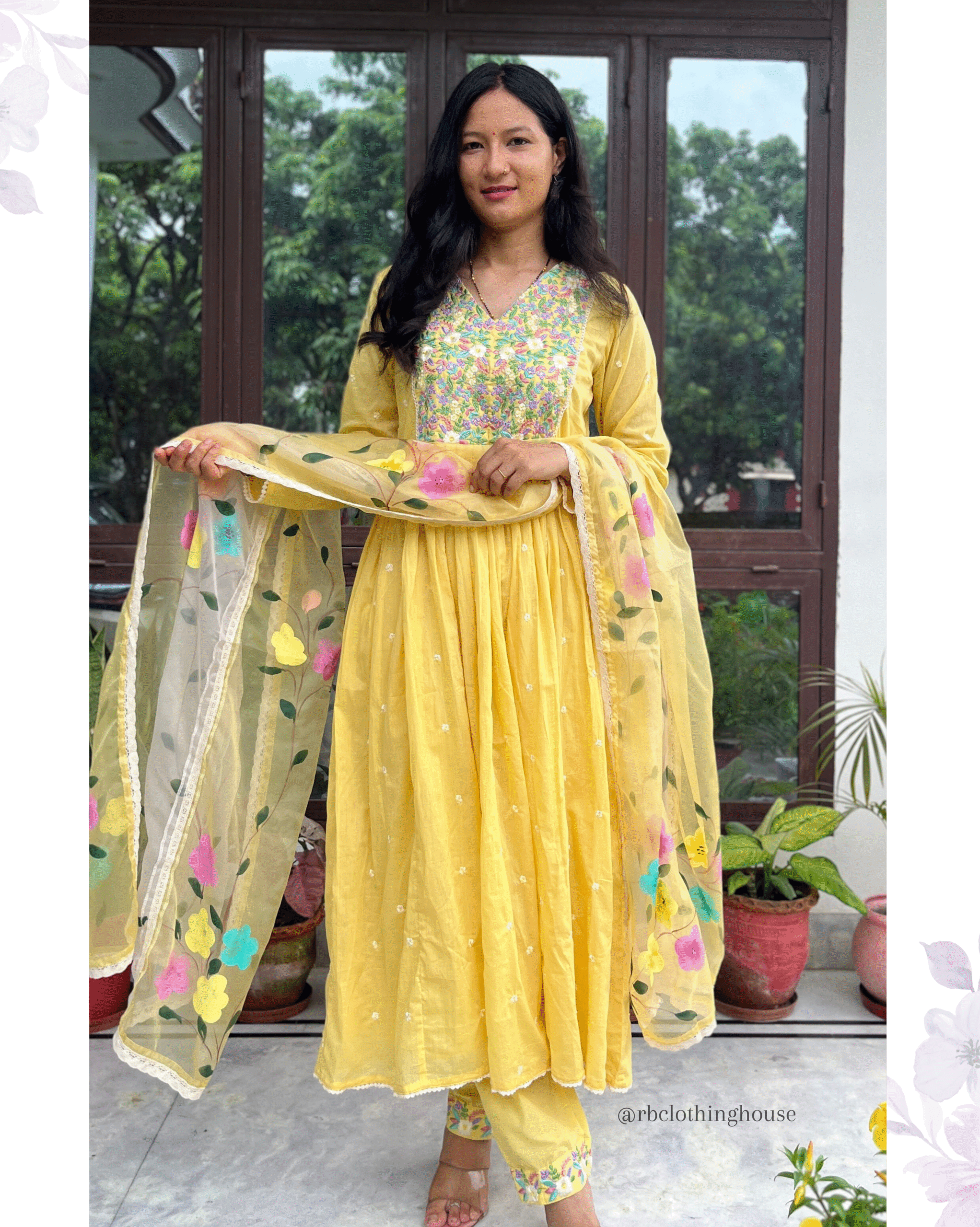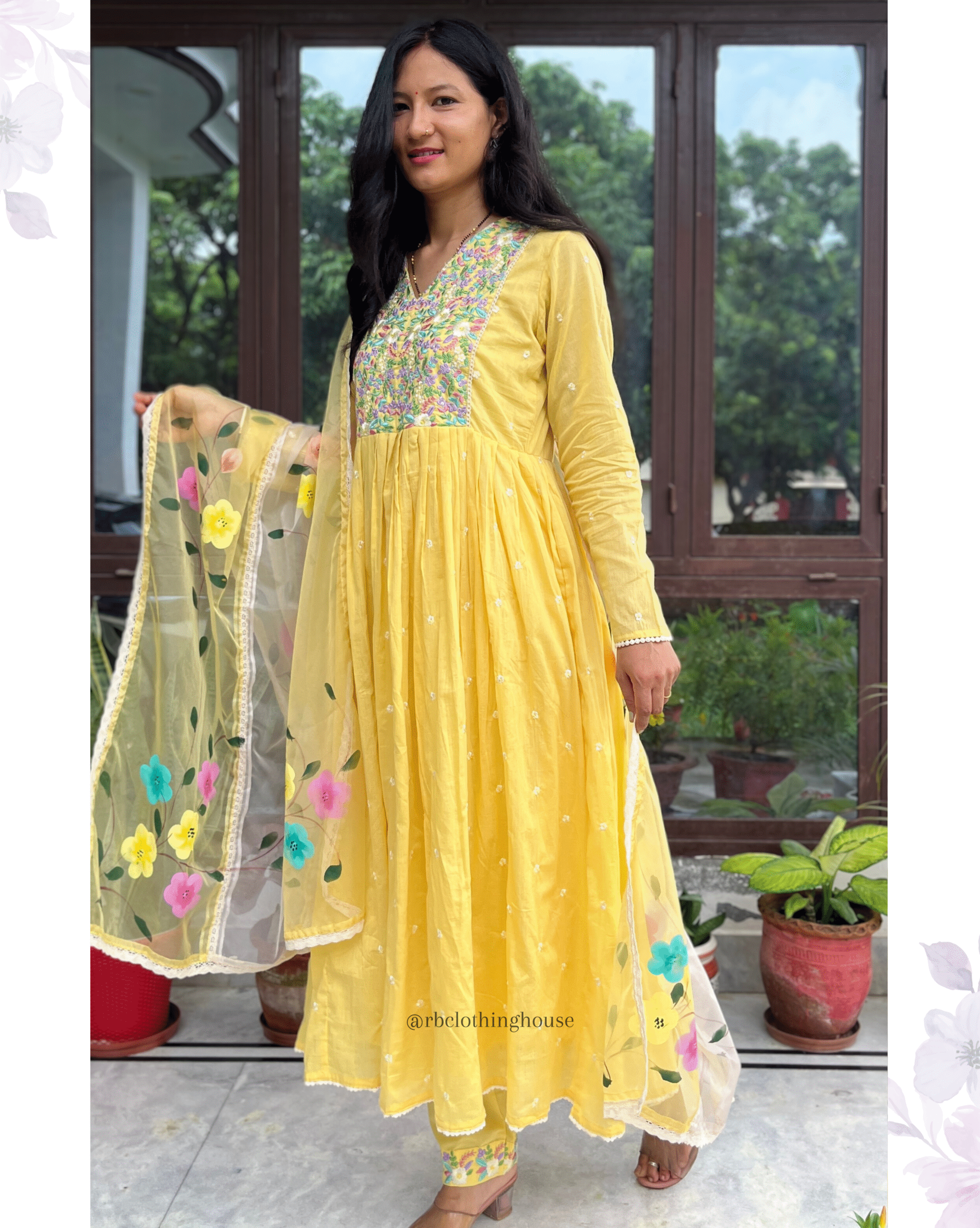 + Free ShippingA stunning yellow Anarkali suit set, this outfit features embroidery on yoke with solid pants and a matching paint brush dupatta that adds a touch of elegance to the overall look. The bright yellow hue is perfect for making a statement at any occasion.
