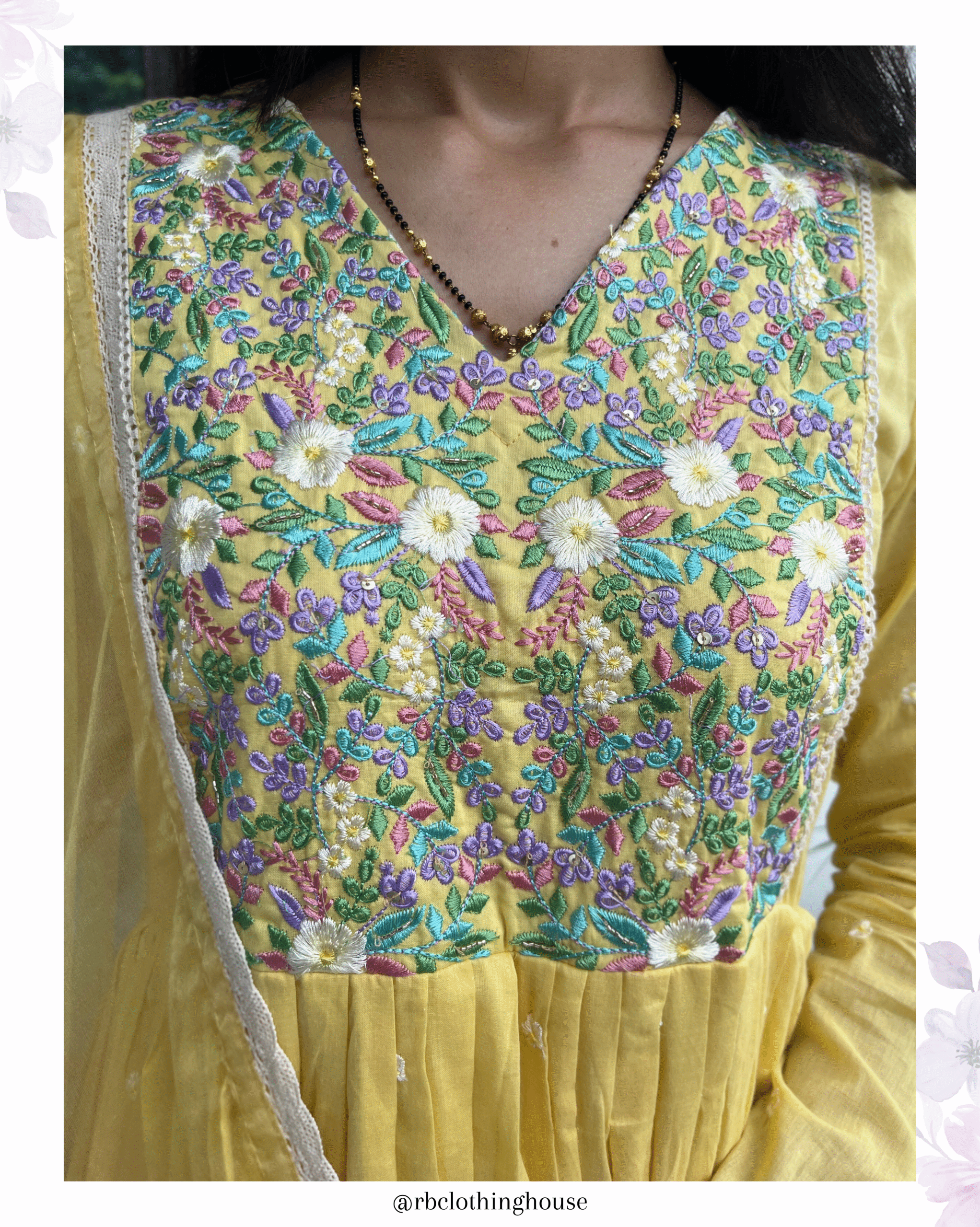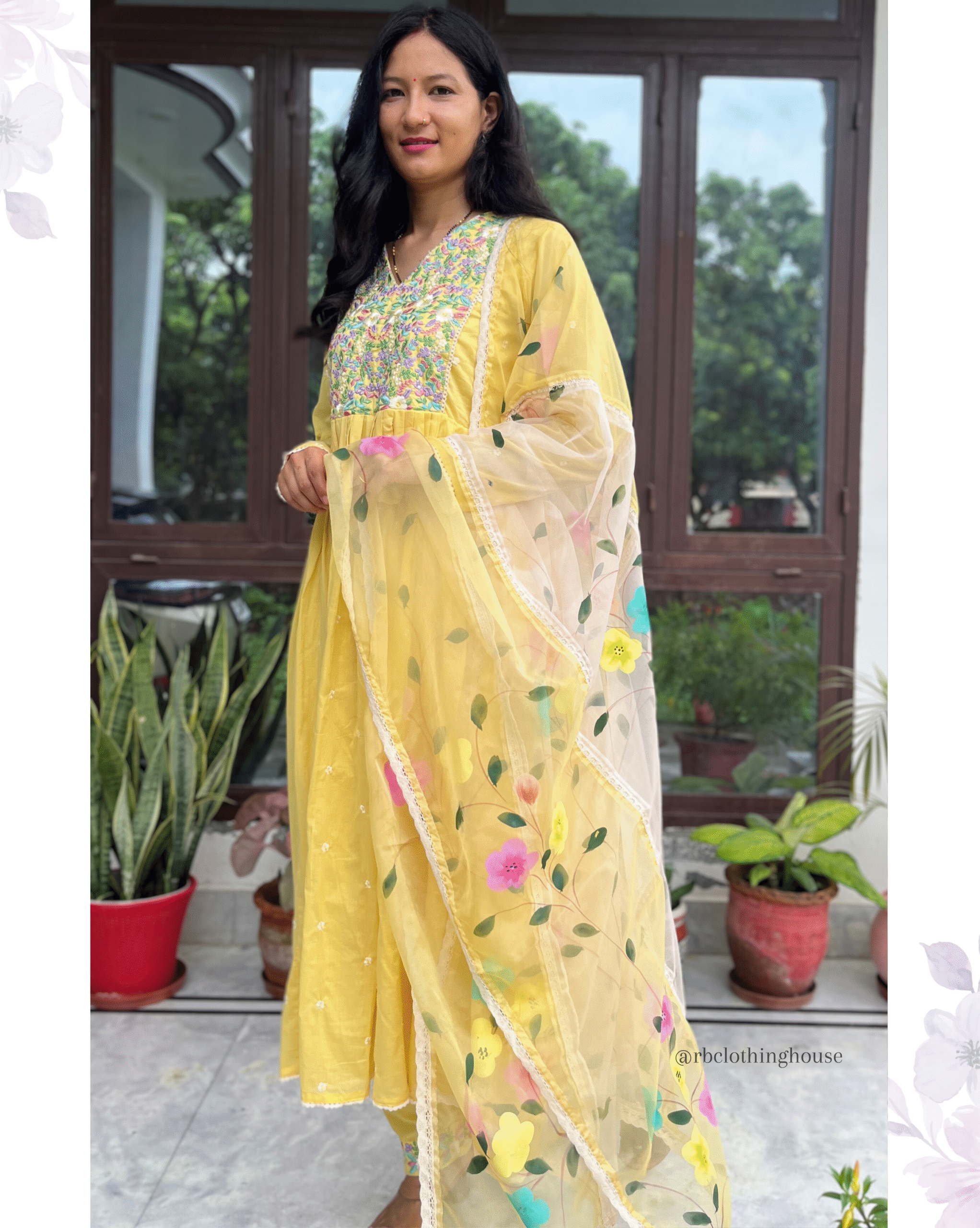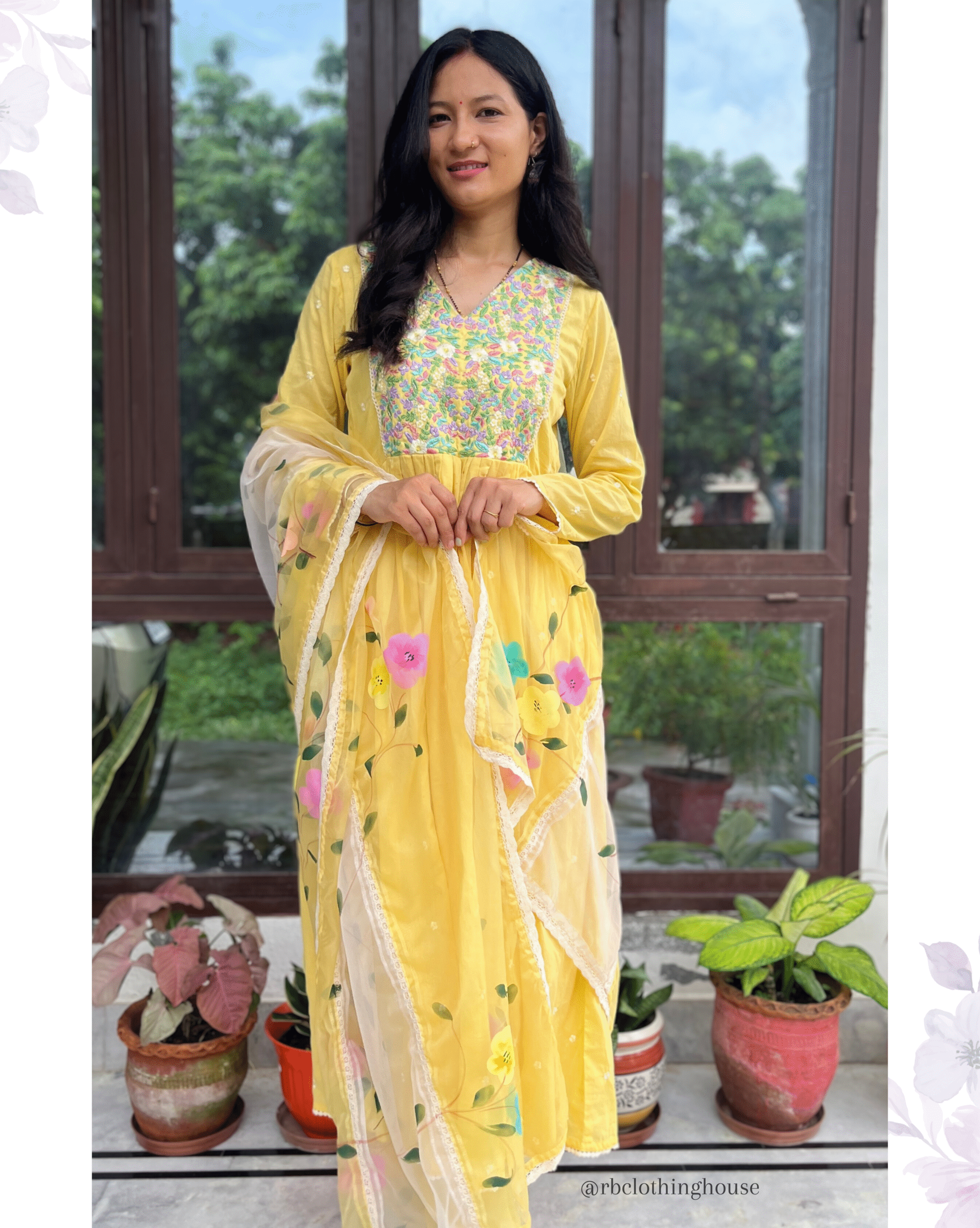 + Free ShippingA stunning yellow Anarkali suit set, this outfit features embroidery on yoke with solid pants and a matching paint brush dupatta that adds a touch of elegance to the overall look. The bright yellow hue is perfect for making a statement at any occasion.